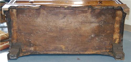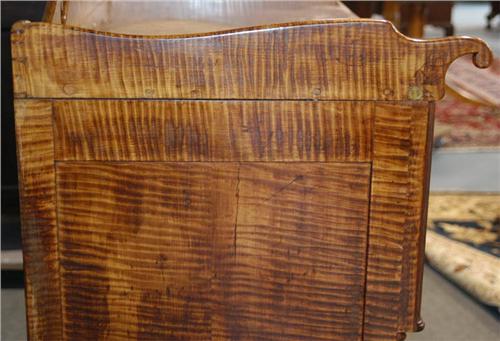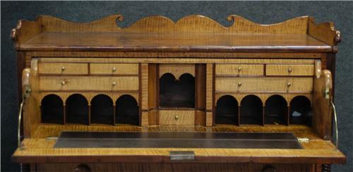 U1 UNUSUAL TIGER MAPLE BUTLER'S DESK with fancy scrolled skirt and gallery, circa 1830, repairs to base including blocking, filled screw holes on both sides, old breaks to front edge molding estimate 3000-5000