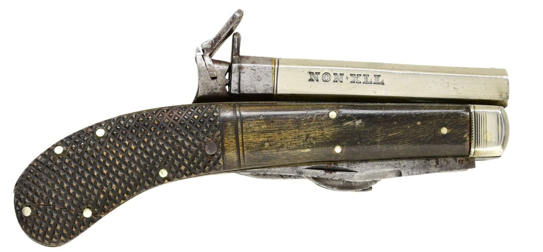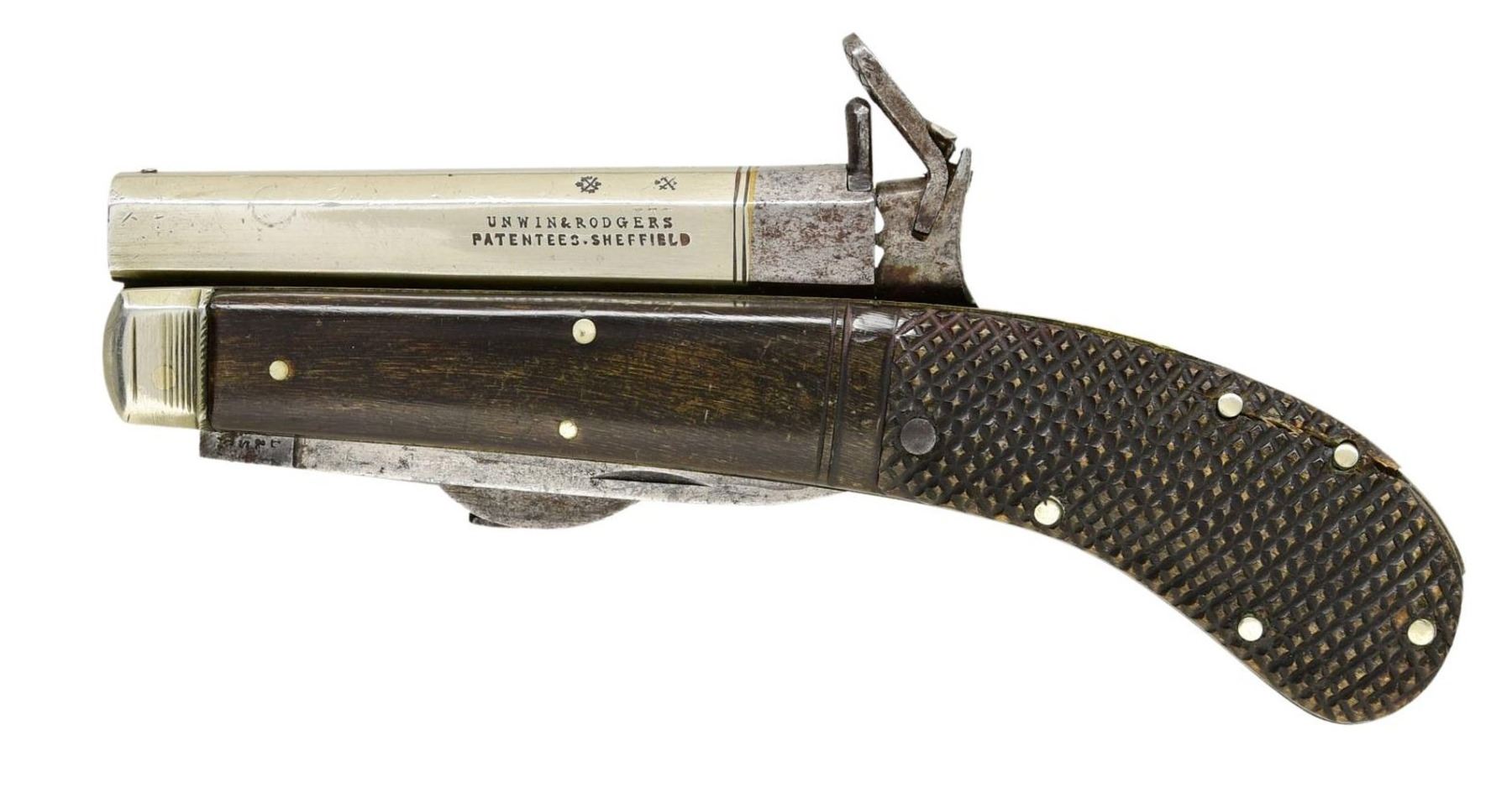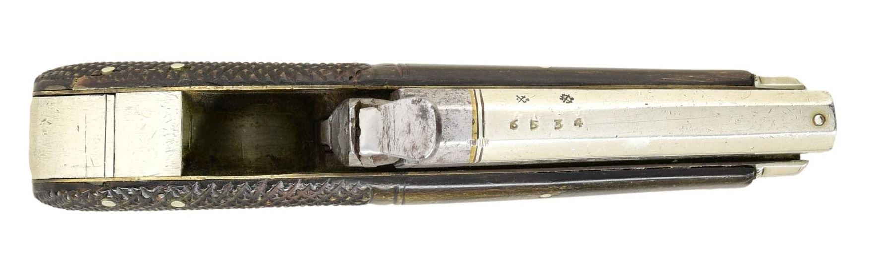 KNIFE PISTOL. Cal. 25. S# 6534. Bbl. 3 5/8". NON XLL single-shot breechloading pistol mfg. by Unwin & Rodgers. The left flat of the faceted bbl. is marked "UNWIN & RODGERS/ PATENTEES.SHEFFIELD", with British proofs on the left quarter flat, the S# over the top flat, as well as "NON XLL" on the right flat. Bbl., bolster, and butt exhibit a German silver finish. 2-piece partially checkered horn grips. The 3 3/8" spear-point blade and the 3 1/2" clip-point blade are marked "NON . XLL/ UNWIN &/ RODGERS/ PATENT" on the left side of the ricassos. Right ear of the rear sight also doubles as an ejector. Hollow butt with a hinged door. CONDITION: German silver components retain the majority of their bright finish, exhibiting small scattered handling marks overall. Iron components, including the breech, rear sight, breechblock, knives, and trigger, exhibit a gray patina, with some light pitting and scattered spots of darker discoloration overall. Smoothbore exhibits some scattered spots and areas of dark pitting, but otherwise is good. Action functions appropriately when cycled by hand. Grips exhibit scattered minor marks and impressions from handling and storage, with a crack present on either side around the butt. (01-24349/MLW). ANTIQUE. $800-1,200.