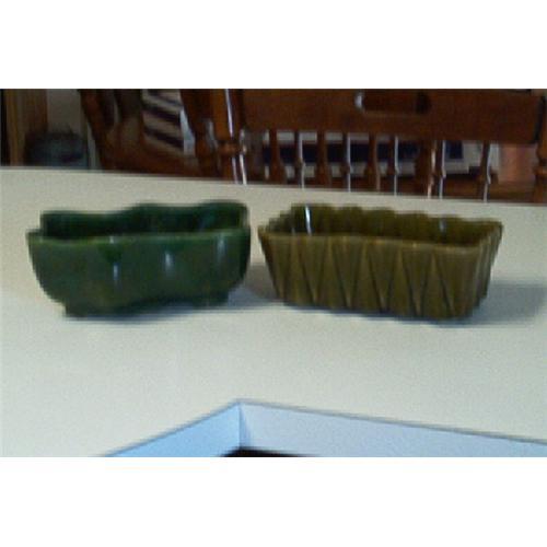 Today's auction brings to you two lovely Upco Planters. The first on is Olive Green and the other planter is a forest green. The olive green planter measures 8 inches long by 3 inches wide and is embossed on the bottom: UPCO-USA. The forest green planter measures: (Really hard to measure because of the shape) from corner to corner (diagally) measures 9 inches long; widest area across the top measures 8 inches; depth measures 3 inches; base diameter measures 5 3/4 inches long by 3 inches wide. Both planters are pretty in their style and color. No chips, cracks, etc noticed. Excellent Condition.