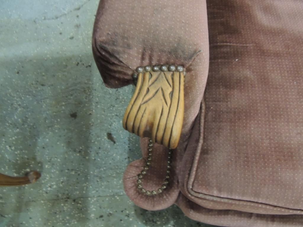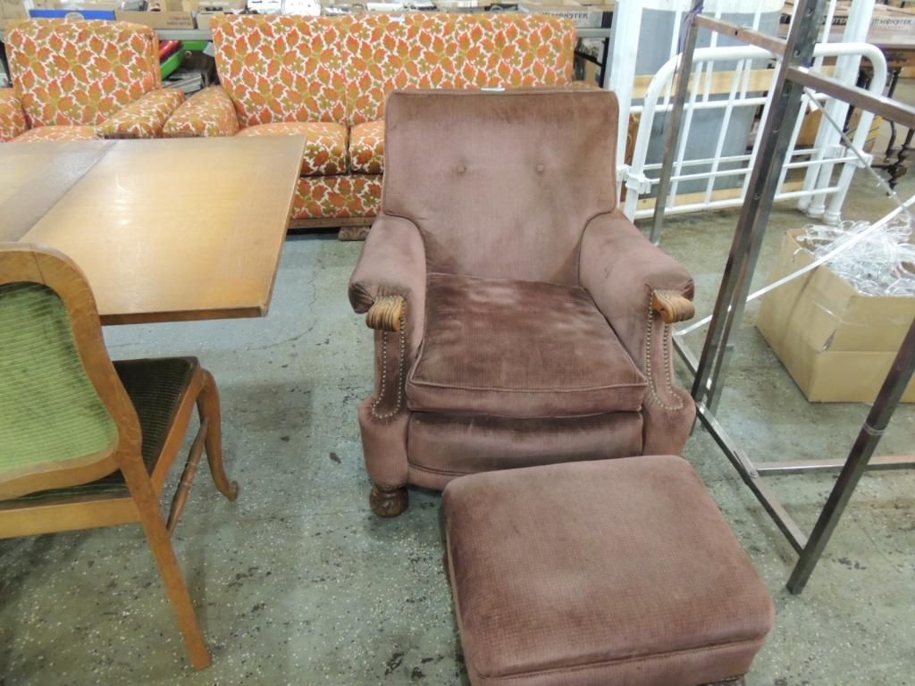 UPHOLSTERED EASY CHAIR AND FOOT STOOL. VINTAGE MAUVE AS SHOWN SEE PHOTO FOR MORE DETAILS.