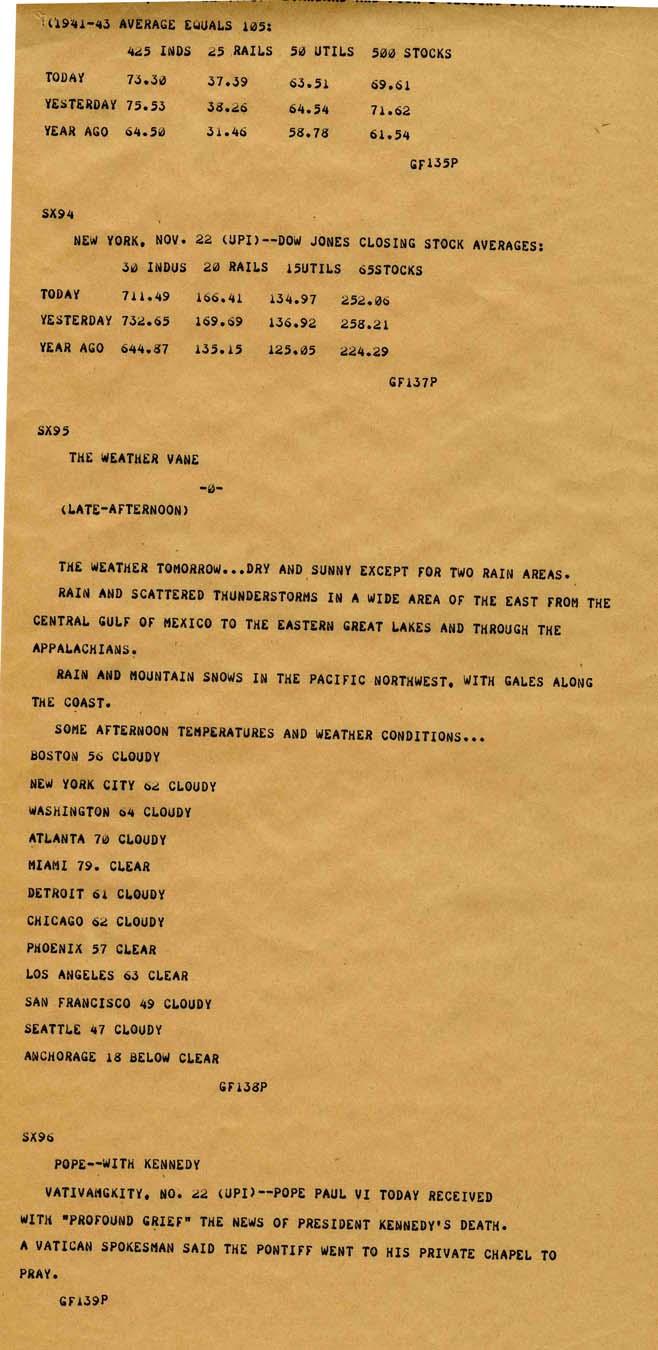 Original UPI teletype from 22 November 1963 with reaction to the murder of JFK. Document reads in part, ''...Pope Paul VI today received with 'profound grief' the news of President Kennedy's death...the Pontiff went to his private chapel to pray...Moscow's radio commentator, in mournful tones...annoumced [sic] the assassination of President John F. Kennedy. 'It is said he has been murdered by the extreme right wing elements,' he said...'' Also includes reaction from President Truman. 25.5'' x 8.25'' teletype toned, else very good.