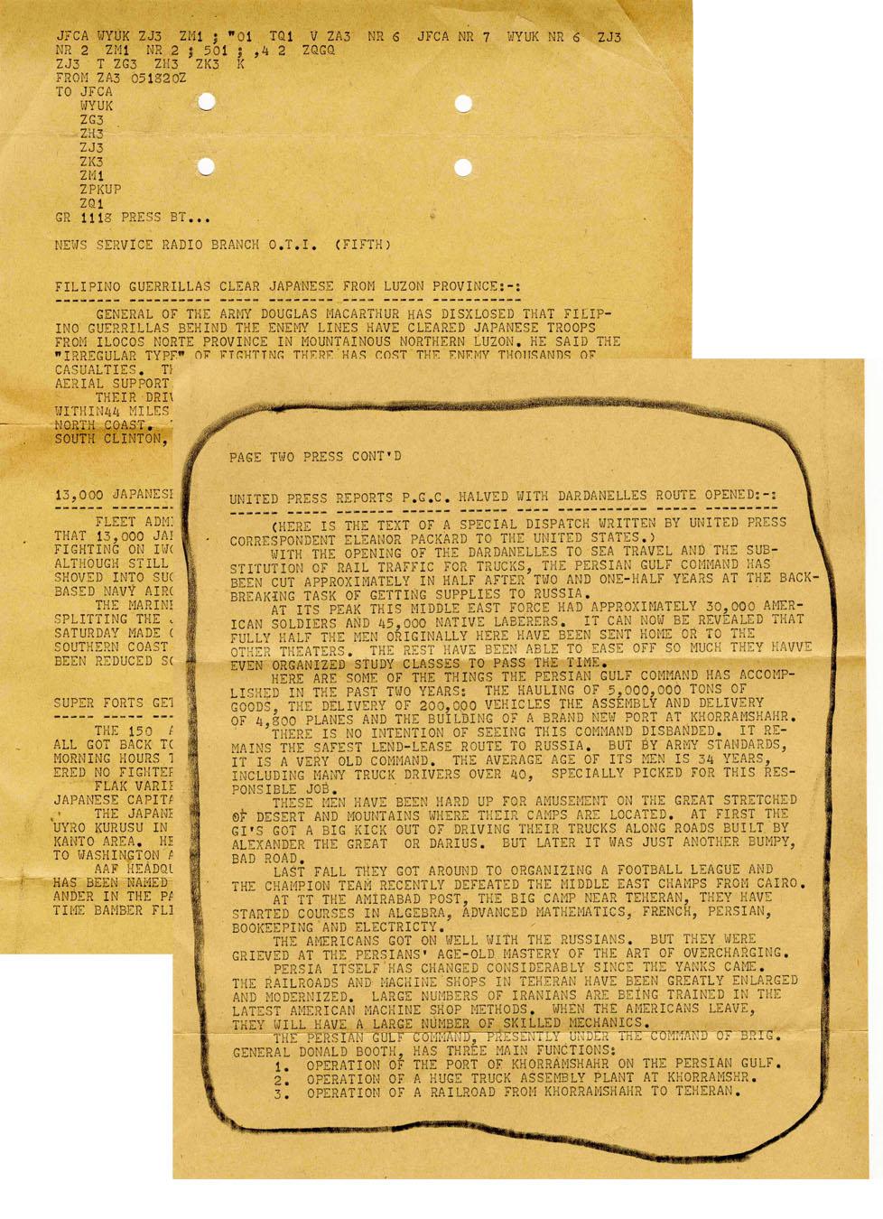 Original UPI teletype, undated, though sometime in March 1945 with prolific WWII news. Document reads, ''…Nimitz has revealed…that 13,000 Japanese dead have been counted in 14 days of fierce fighting on Iwo Jima…The Japanese, although still resisting with their customary fanaticism…'' With additional reports on Roosevelt's health after the Yalta Conference, guerilla warfare, troops in the Persian Gulf and military plans after Germany's defeat. With punch holes at top and some notations, otherwise very good. Measures 30.5'' x 8.5''.
