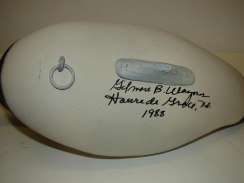 UPPER BAY, MARYLAND BLUEBILL DRAKE DECOY. Slightly turned head. Shows minor split to wood at top of body. Signed on bottom “Gilmore B. Wagoner/Havre de Grace, Md./1988”. 14” L
