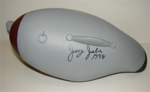 UPPER BAY, MARYLAND WIDGEON DRAKE DECOY. Slightly turned head. Signed on bottom “Joey Jobes/1998”. 15” L