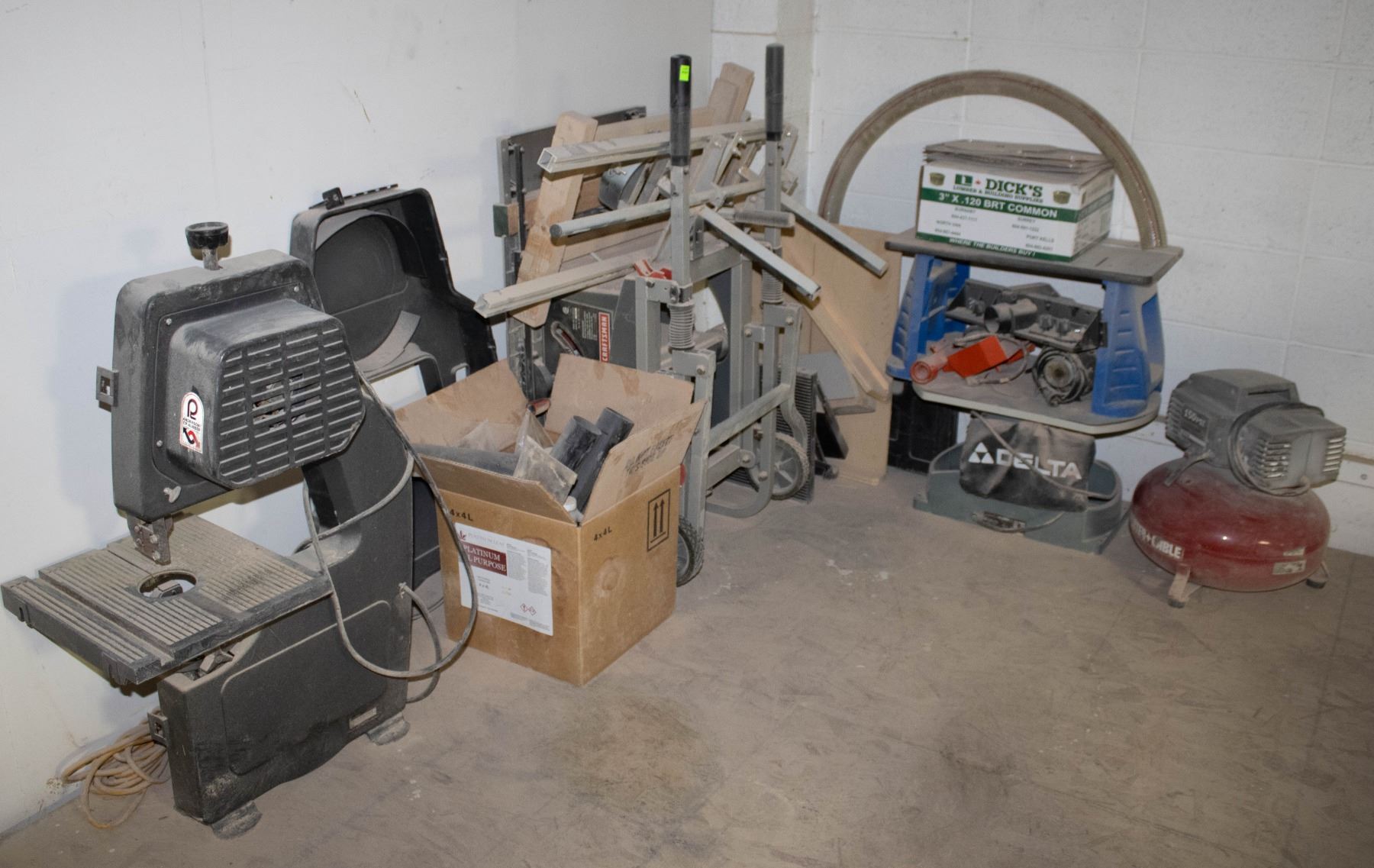 AIR COMPRESSOR, CRAFTSMAN TABLE SAW, BAND SAW AND MORE. **ATTENTION: ALL LOTS ARE LOCATED OFF-SITE. ALL ITEMS ARE SOLD AS IS. BUYER IS RESPONSIBLE FOR REMOVAL OF ASSETS. VIEWING DAY IS AUGUST 11 FROM 10-4PM.