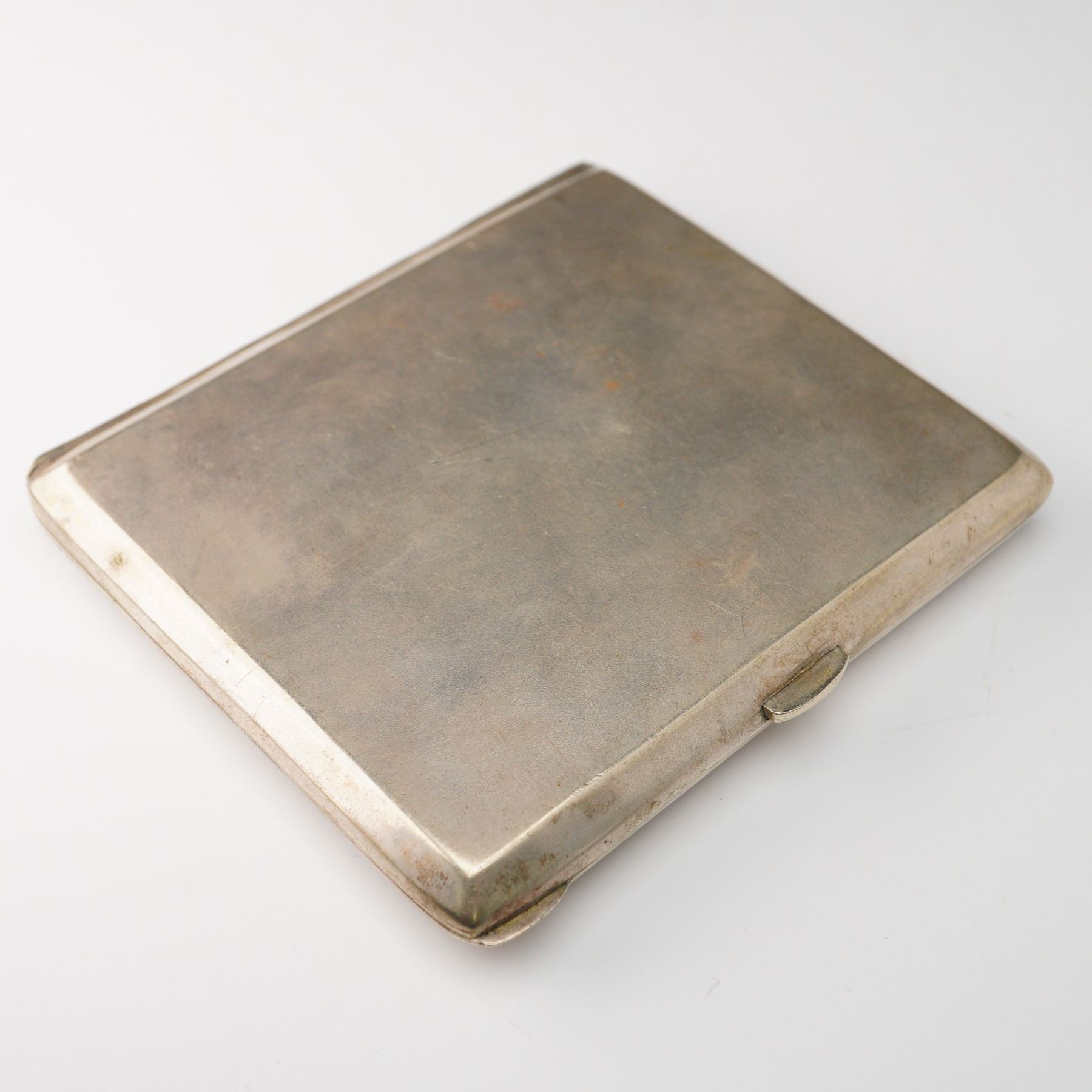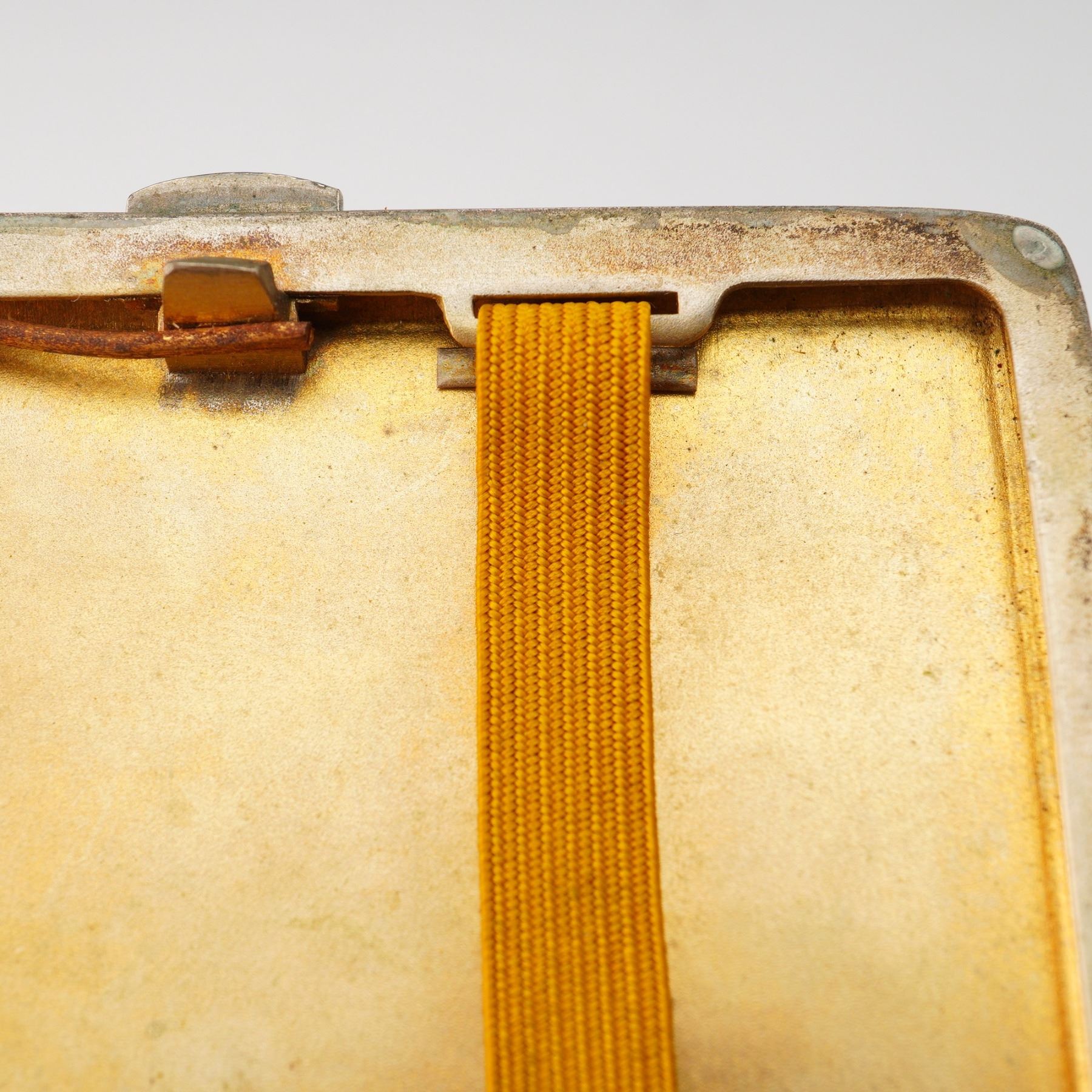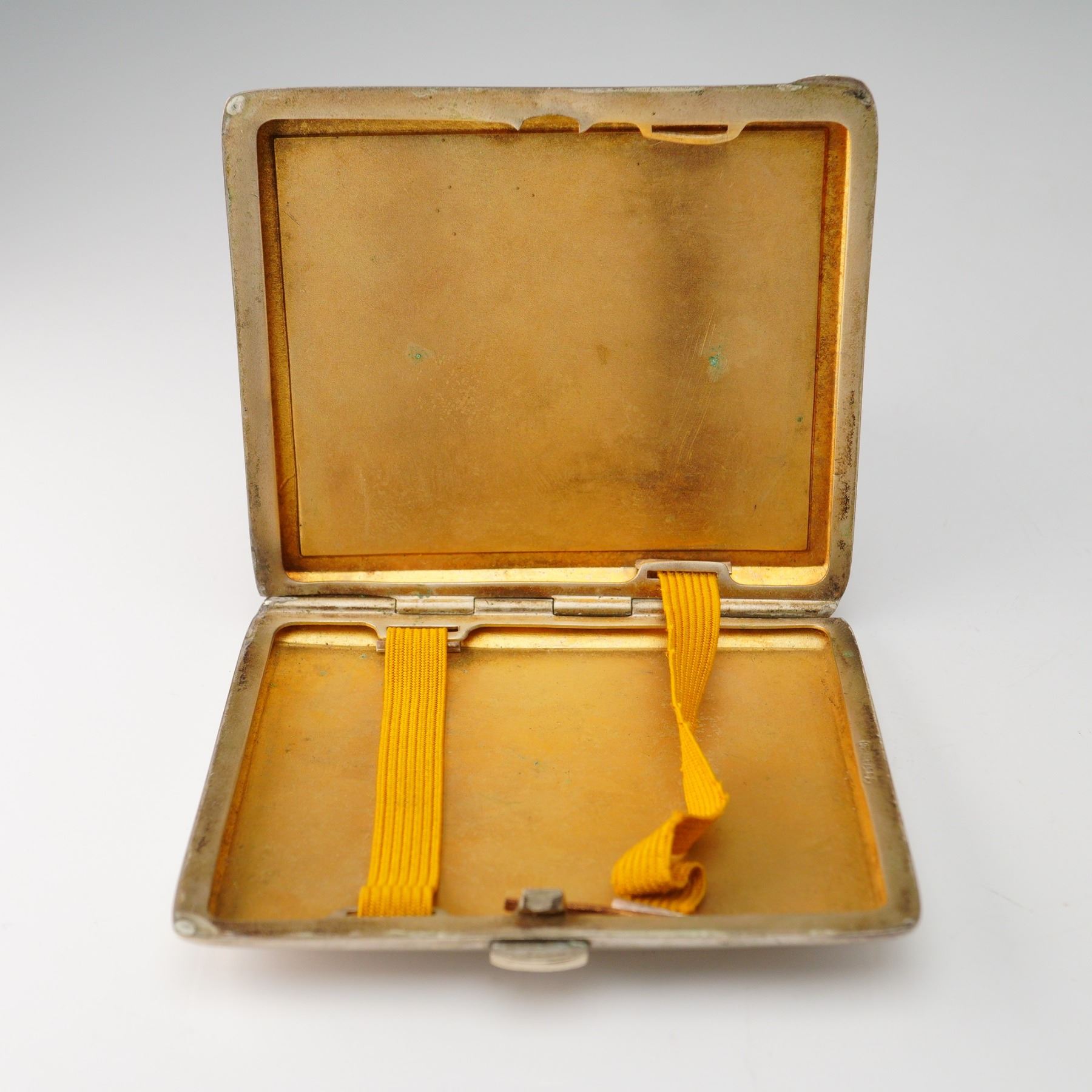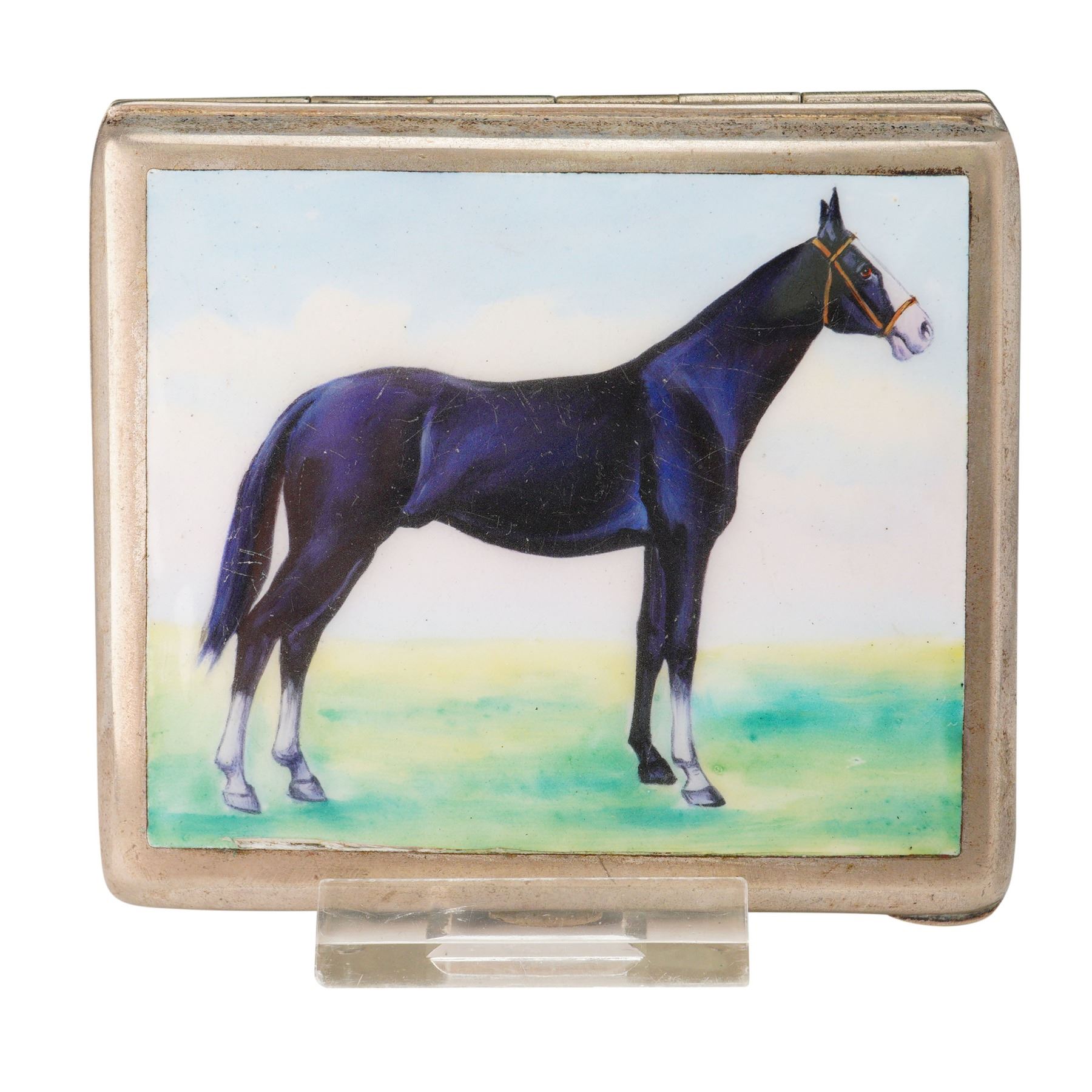 A German silver-plated cigarette case featuring a detailed hand-painted equestrian scene on the front panel. The central enamel plaque depicts a full-body profile of a dark horse in a grassy field against a pastel sky, executed with precision and vivid coloration. The scene is bordered by a rectangular silver-plated frame. The interior is gold-toned and fitted with two mustard-yellow elastic bands designed to secure cigarettes or similar slim contents. The interior also shows patina consistent with age and use. The case bears the stamp "UR-ALPACCA," indicating the use of Alpaca, a German nickel silver alloy often used in decorative and functional items for its durability and silver-like appearance.