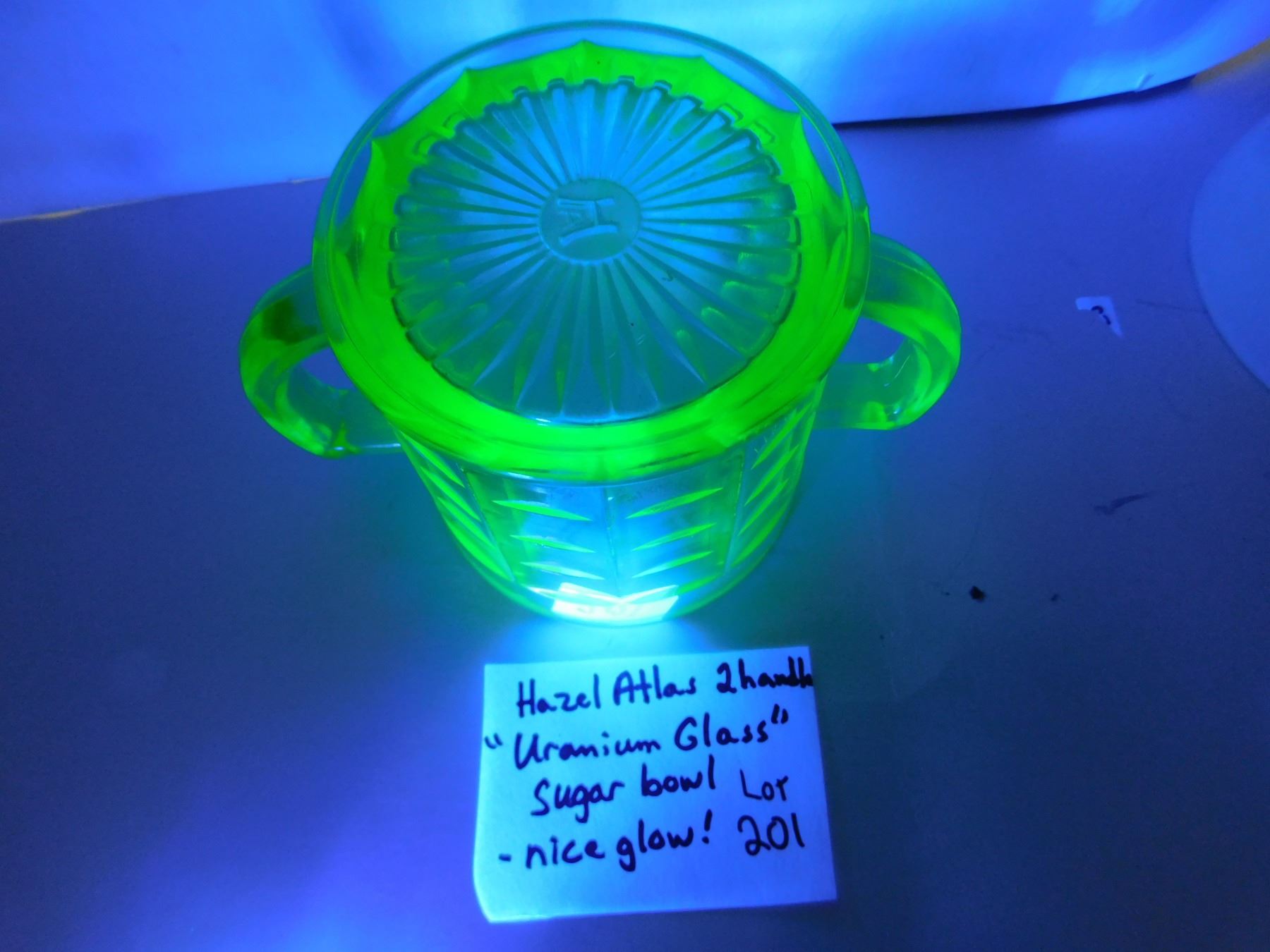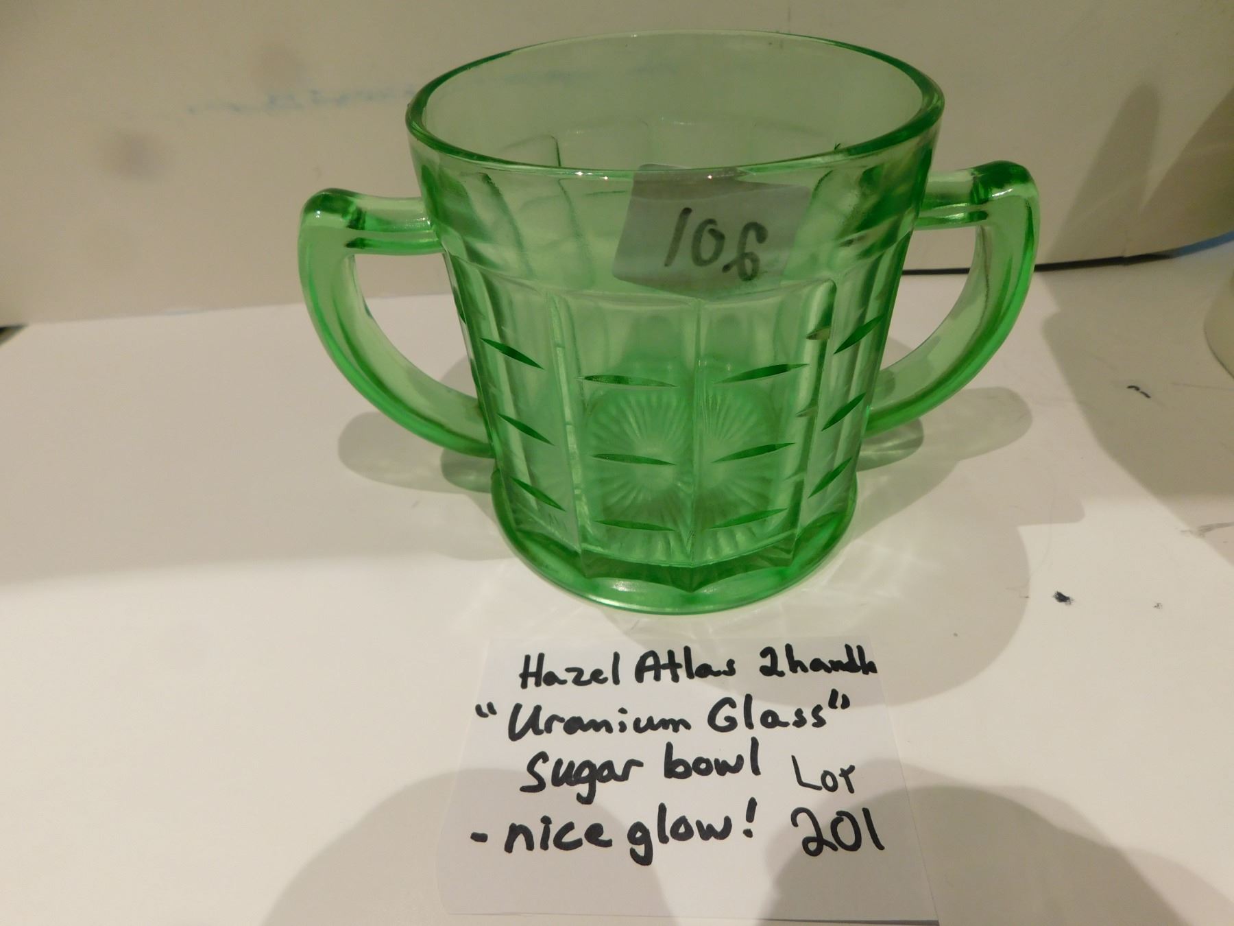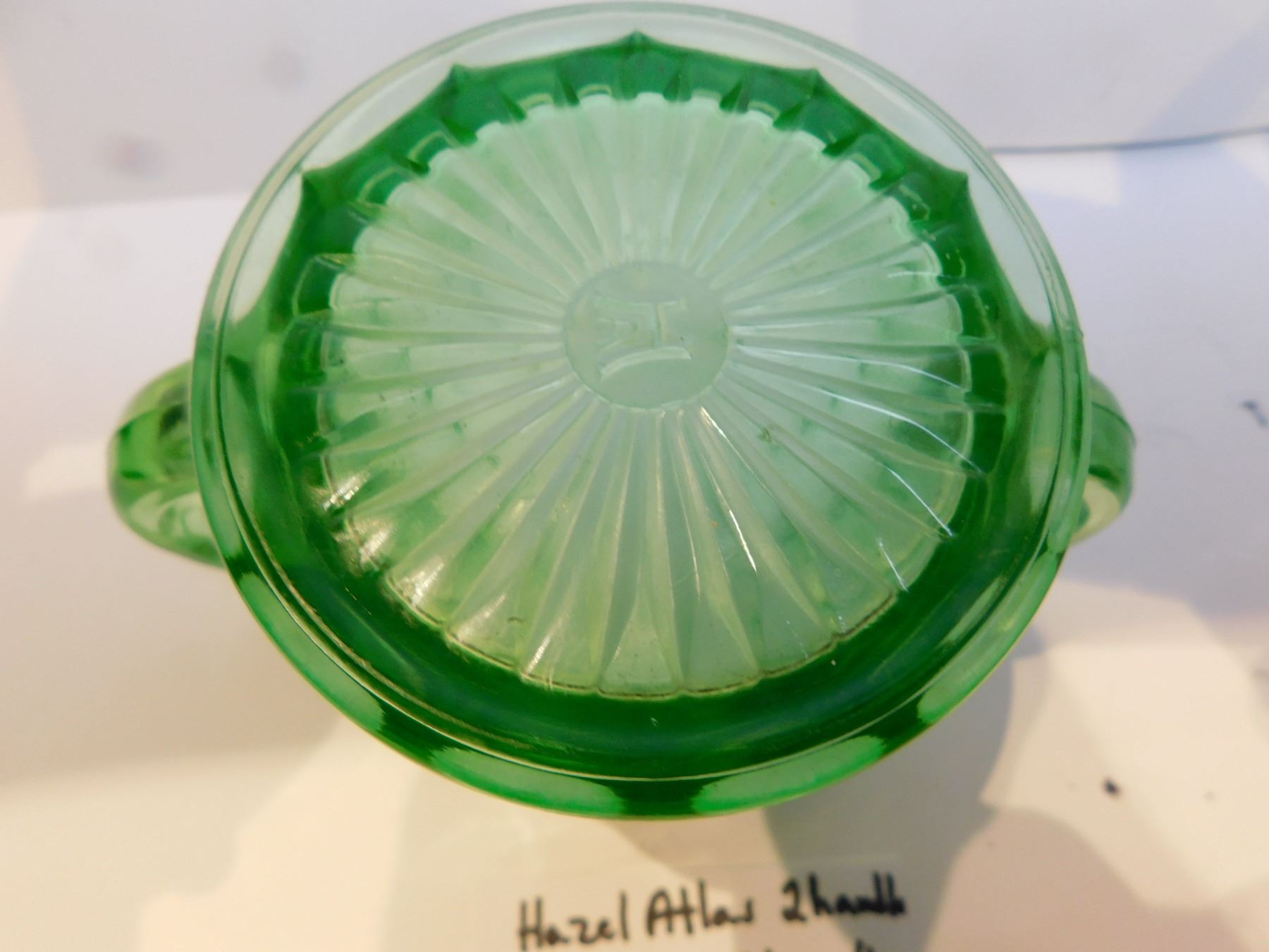 URANIUM GLASS, HAZEL ATLAS TWO HANDLE GLASS SUGAR BOWL