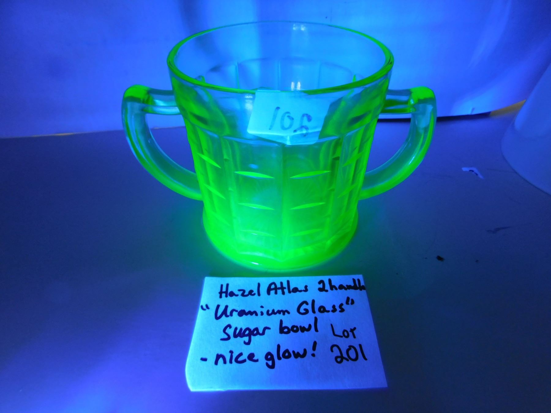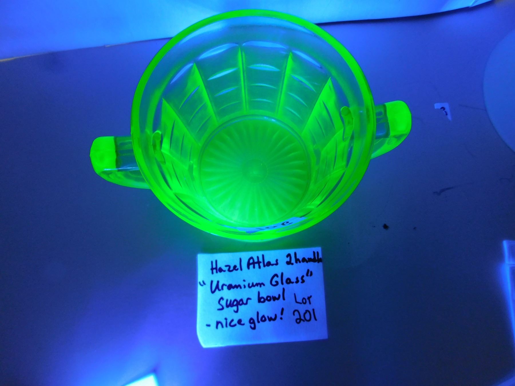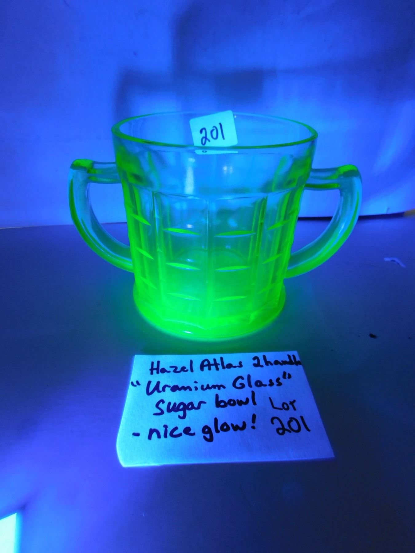URANIUM GLASS, HAZEL ATLAS TWO HANDLE GLASS SUGAR BOWL