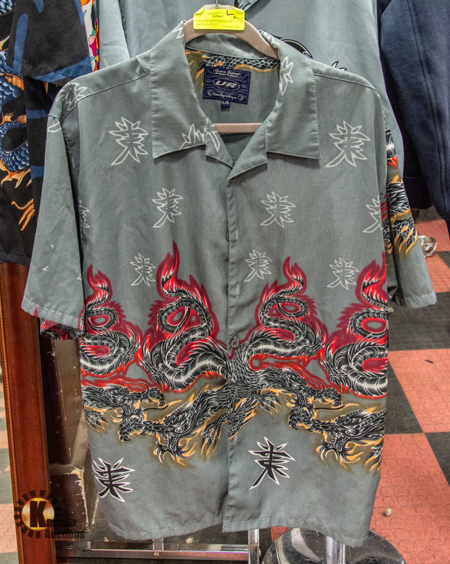 SHORT SLEEVE BOTTON-DOWN COLLAR SHIRT WITH GRAPHIC DRAGON DESIGN - BLACK DRAGONS WITH RED & GOLD COLOURS - MEN'S SIZE L **ALL ITEMS MUST BE REMOVED BY 5PM SATURDAY, SEPTEMBER 30TH 2023. ALL REMAINING ITEMS WILL BE SUBJECT TO A $6.00 PER DAY STORAGE CHARGE. ANY ITEMS REMAINING AFTER MONDAY, OCTOBER 16TH, 2023 WILL BE CONSIDERED FORFEITED. NO REFUNDS WILL BE ISSUED FOR FORFEITED ITEMS. TO SCHEDULE A PICK UP APPOINTMENT CLICK HERE