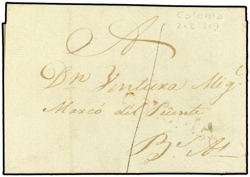 1809 COLONIA a BUENOS AIRES. Marca lineal COLONIA en rojo (estampación debil).