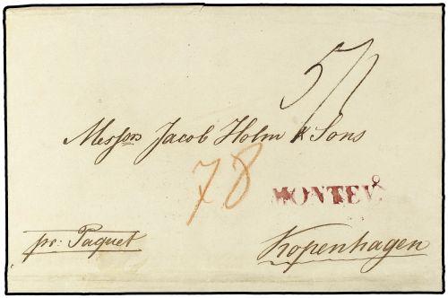 1843 (Oct 27) Entire letter from MONTEVIDEO to COPENHAGEN, Denmark ´via LONDON´, with superb strike of Uruguayan MONTEVo despatch handstamp in red and British manuscript rate 5/1 d. LONDON transit on reverse and oval ST. P. A. datestamp of Jan 13th, 1844. Charged due 78 sk. in brown crayon. A very rare entire to a most unusual destination.