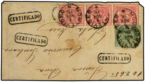 36,38(3) 1876 FRONTAL de carta certificada circulada de MONTEVIDEO a STA. ROSA. 10 ctvos. verde (defecto) y 20 ctvos. rosa,tira de tres. Precioso y raro franqueo.