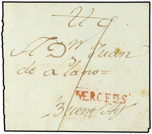 (1801 CA.) MERCEDES a BUENOS AIRES. Envuelta de carta con la rarísima marca MERCEDES (PE 1) en rojo. Muy bien estampada.