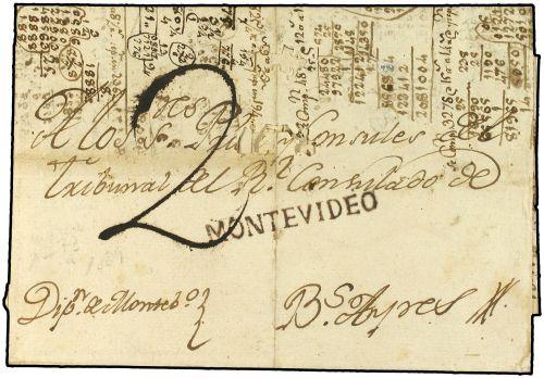 (1804 CA) MONTEVIDEO a BUENOS AIRES. Marca lineal MONTEVIDEO en rojo, algunas erosiones en el frente.