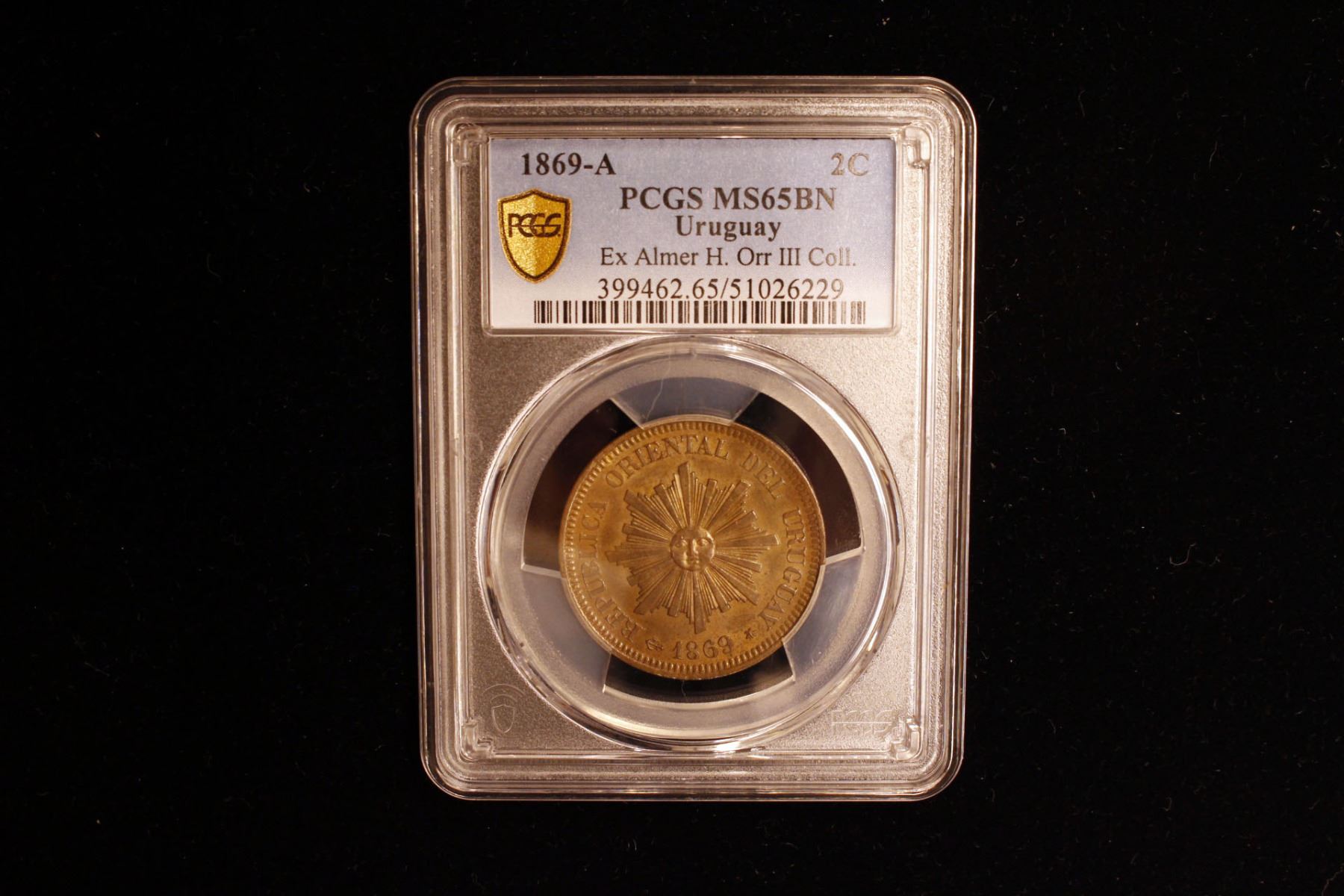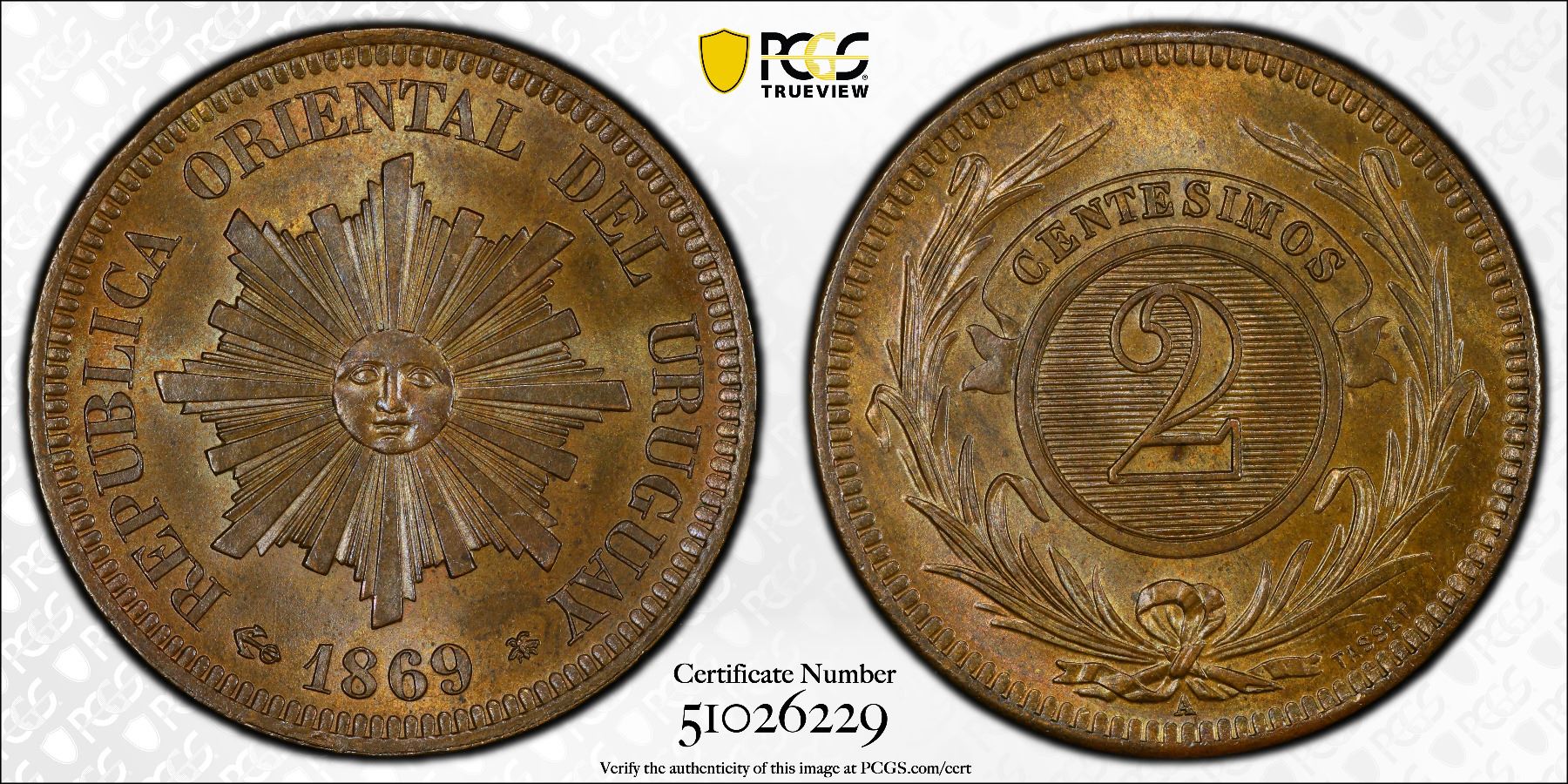 URUGUAY: Republic, AE 2 cenetesimos, 1869-A, KM-12, Y-6, struck at the Paris mint, a superb example, PCGS graded MS65 BN, ex Almer H. Orr III Collection.