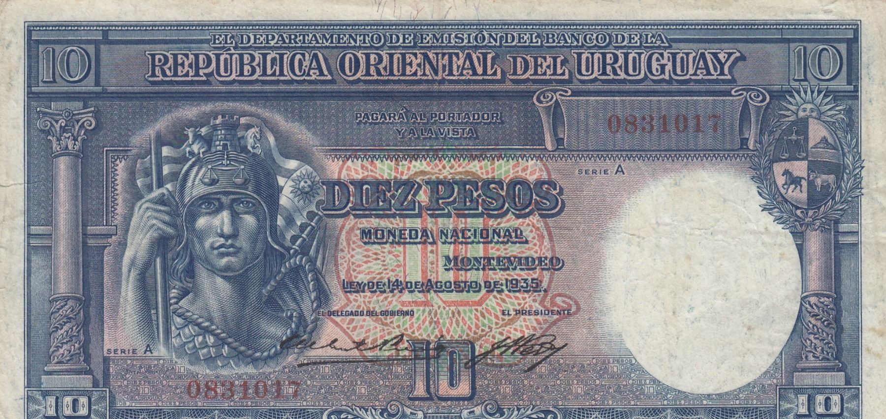 Uruguay, 10 Pesos, 1935, VF, p30a