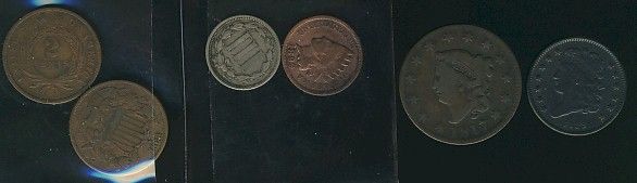US 1835 Half Cent (F12), 1817 1¢(VG), 1899 1¢(VG), 1867, 1868 2¢ (F12) & 1865 3¢(VG). Lot of 6 coin