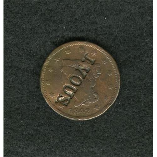 <B>1842 U.S. Large Cent Counterstamped J. Yous.</B></I> This 1842 U.S. large cent has been counterstamped with the name J. Yous (Joshua) who was located in Greencastle, Pennsylvania. He was born in 1827 and was a gunsmith from 1854-1861, later becoming a machinist. He died in 1905. Brunk Y-68, Rulau Pa-703G.<BR><BR><b>Shipping:</b> Coins & Currency (<a target="_blank" href="http://www.heritageauctions.com/common/shipping.php">view shipping information</a>)