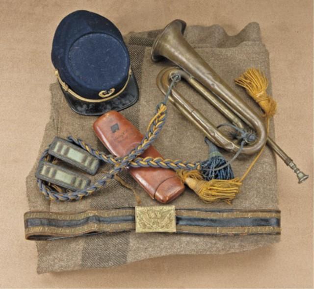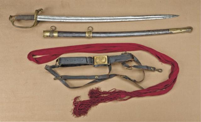 US 1850 Officer’s Sword with imported blade, original scabbard, belt with hangars, belonging to Captain H. C. Risdon New Jersey Volunteers, with GAR period officer’s kepi, captains epilates, inscribed cigar case, officer’s sash. The sword is in good condition, blade nicely etched, showing most original polish, some pitting, good grip, traces of gold gilt. Some light to heavy pitting on body of metal scabbard. The belt is good with good buckle. The belt shows an added leather tab behind the buckle which identifies the owner. Along with a GAR kepi with “26” Regt insignia, in very good condition, a high quality woven wool blanket with initials H.C.R. stitched, showing some losses and normal aging. A scarlet colored sword sash in good condition, a large cigar case of high quality leather with “Henry C. Risdon, Mt. Holly, NJ”, captain’s epilates. This ensemble was sold by Little John’s in the early 1990’s and had come to us from an agent for the original heir Est: $3,000 - $6,000