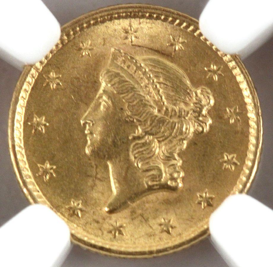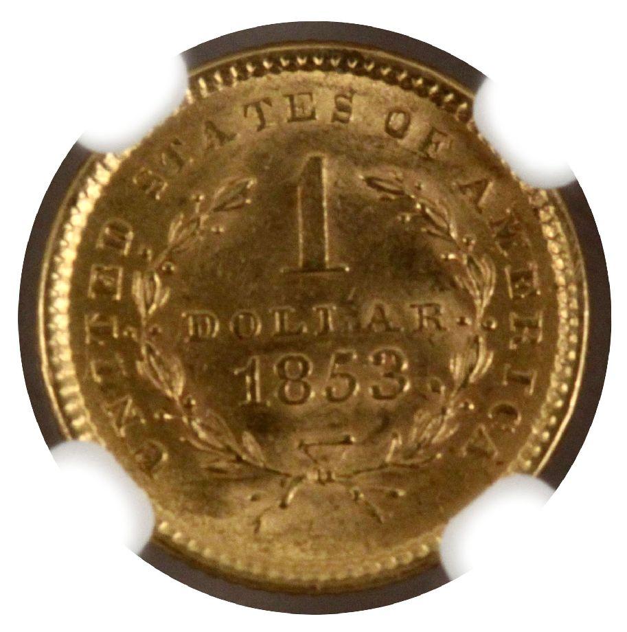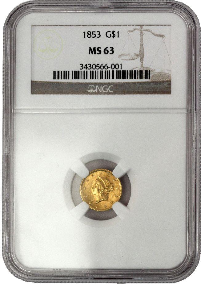 US type I 1853 gold $1 Liberty Head coin in NGC graded MS-63 holder.