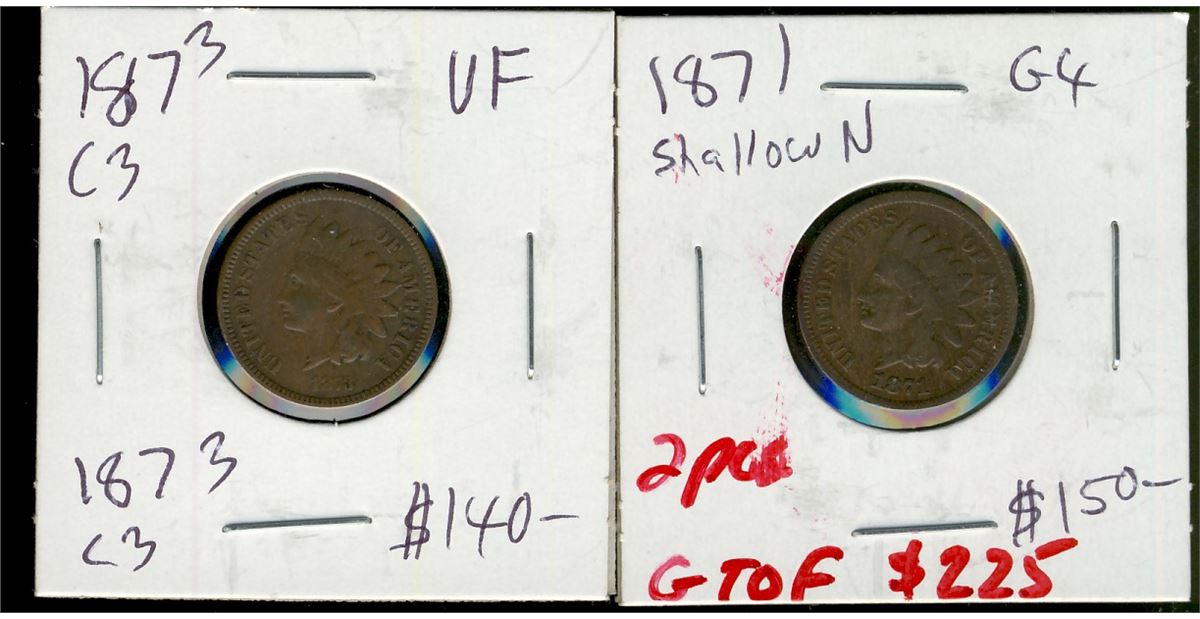 US; 1871 1¢ & 1873. Lot of 2 coins VG to VF.