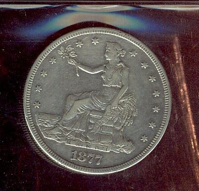 US; 1877 Trade $1. Fine cleaned for grade.