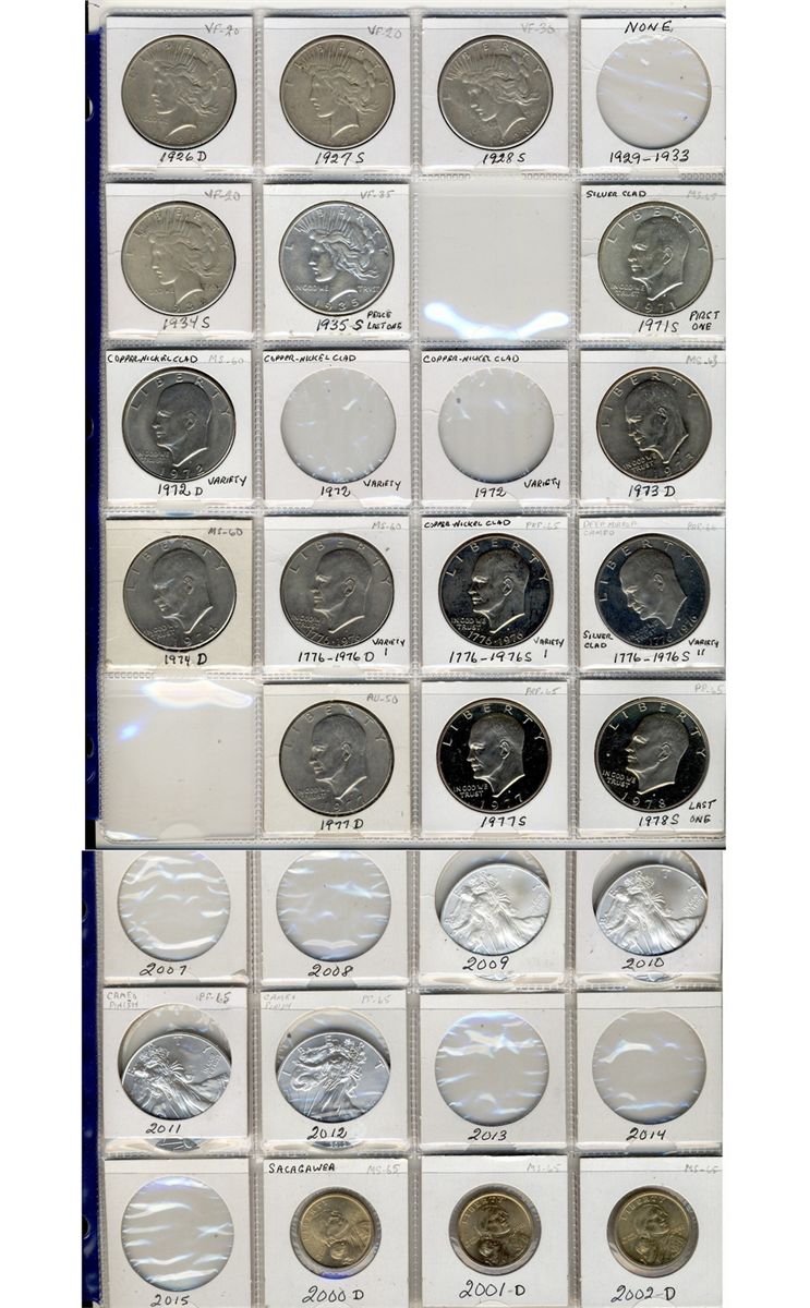 US 1878S $1 to 2012D incomplete Date Set. Lot includes Morgan's(6), Peace Dollars(10), Silver Eagles(7) and more… 77 pcs in all, VF to Proof.