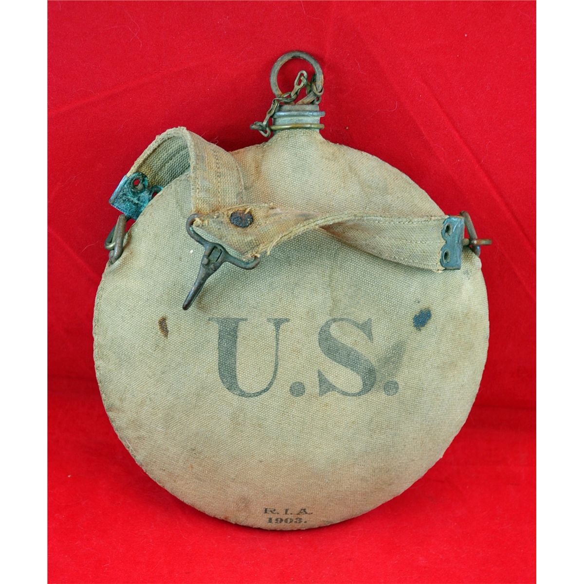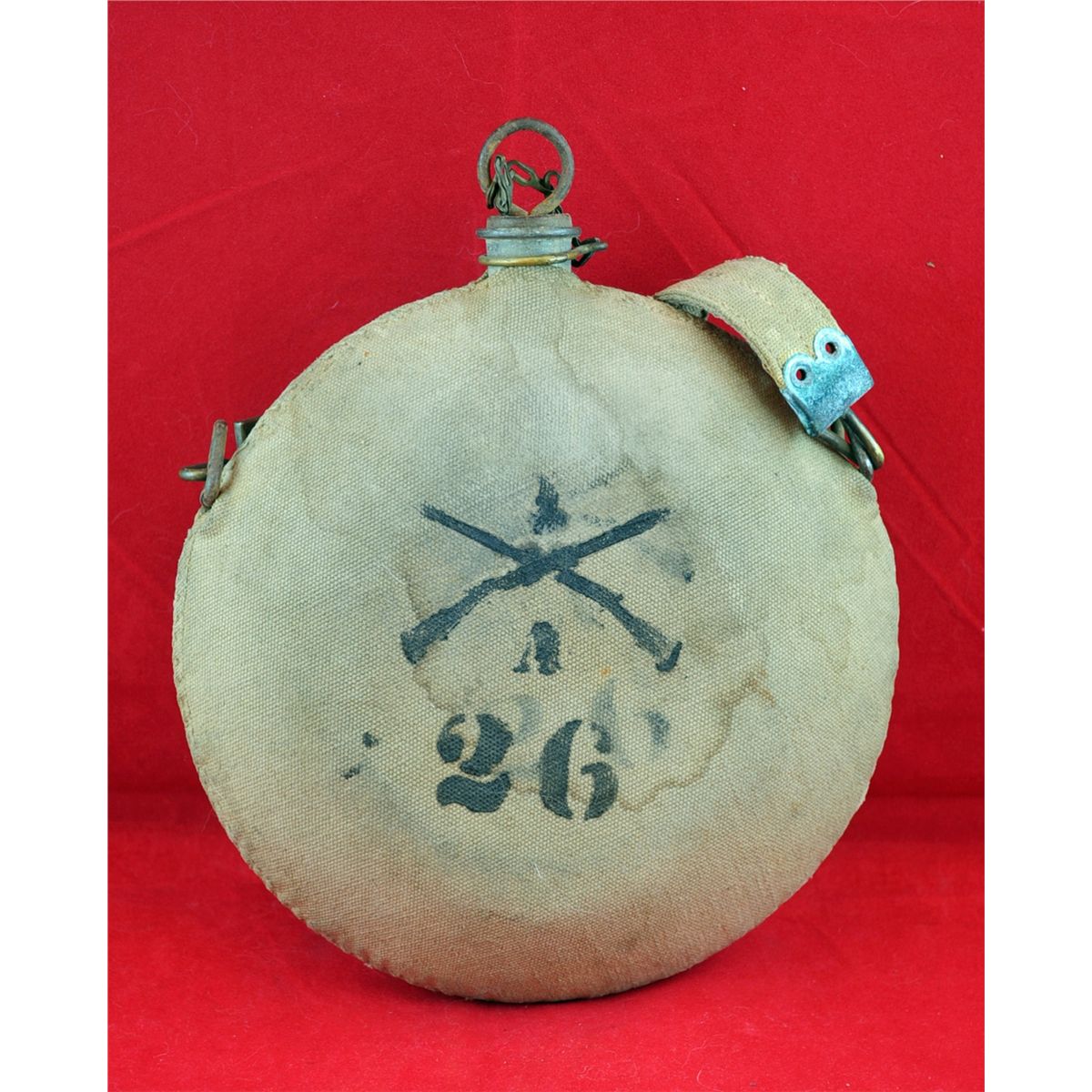 US 1903 CANTEEN, Company A 26th Infantry, marked R.I.A. "Rock Island Arsenal". 8" diameter, Good condition.