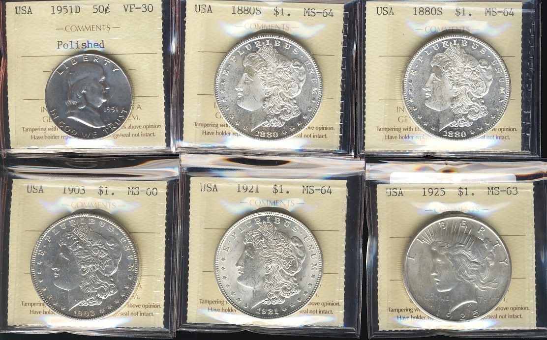 US 1951D 50¢, $1 1880S(2) MS64, 1903 MS60, 1921 MS64 & 1925 MS63. Lot of 6 pcs all ICCS graded with halve designated as polished.