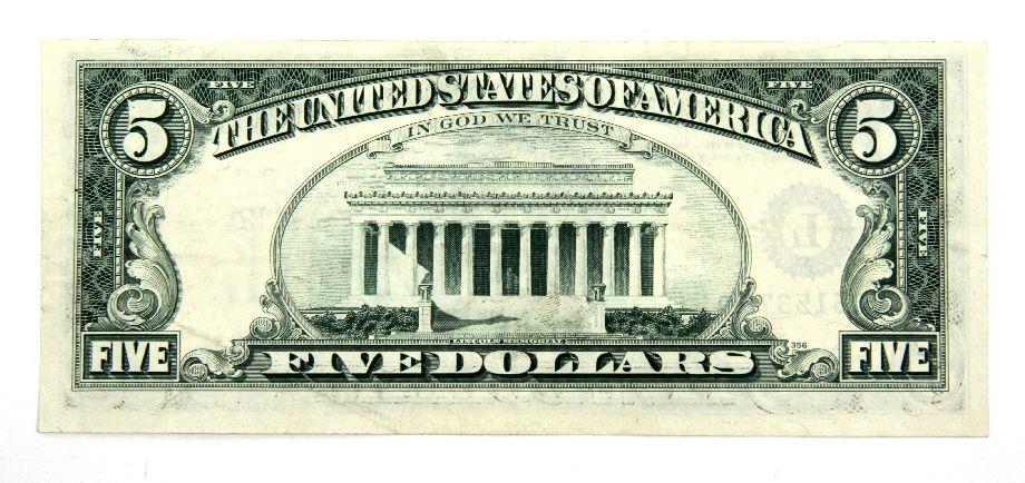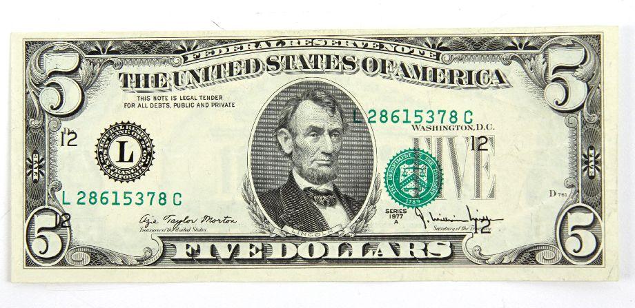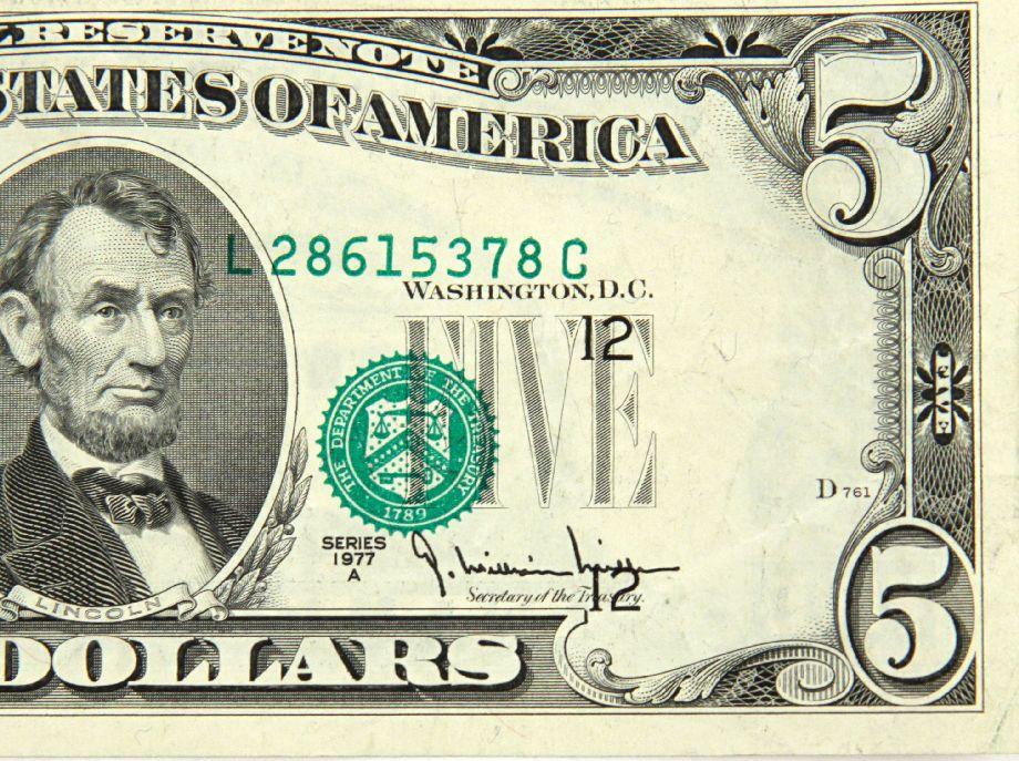 CH 1977A San Francisco $5 Federal Reserve note with dramatic shift left 3rd printing. Serial # L28615378C.