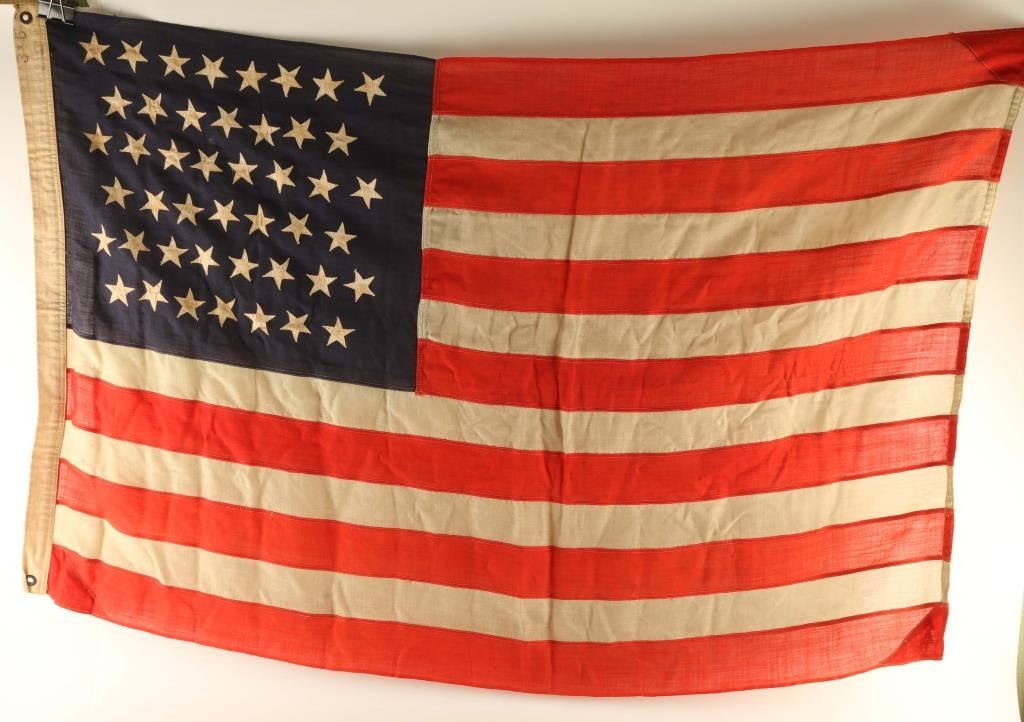 Measures 3' x 5' and commemorates the induction of the State of Utah in 1896. This flag was used during the Spanish American War 1898 and was the official flag for 12 years. Flag is composed of wool bunting and is all sewn by machine. Flag has no tears and minor moth holes. In very good condition for its age.