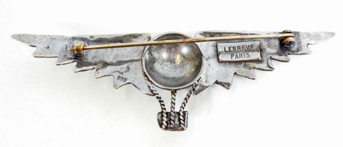 Measures 3 3/8" wide by 1 1/16" tall. The reverse side is maker marked 'Lebreve Paris'. It is also marked '935' for the silver content. Has a thin horizontal pin back with a 'c' catch.