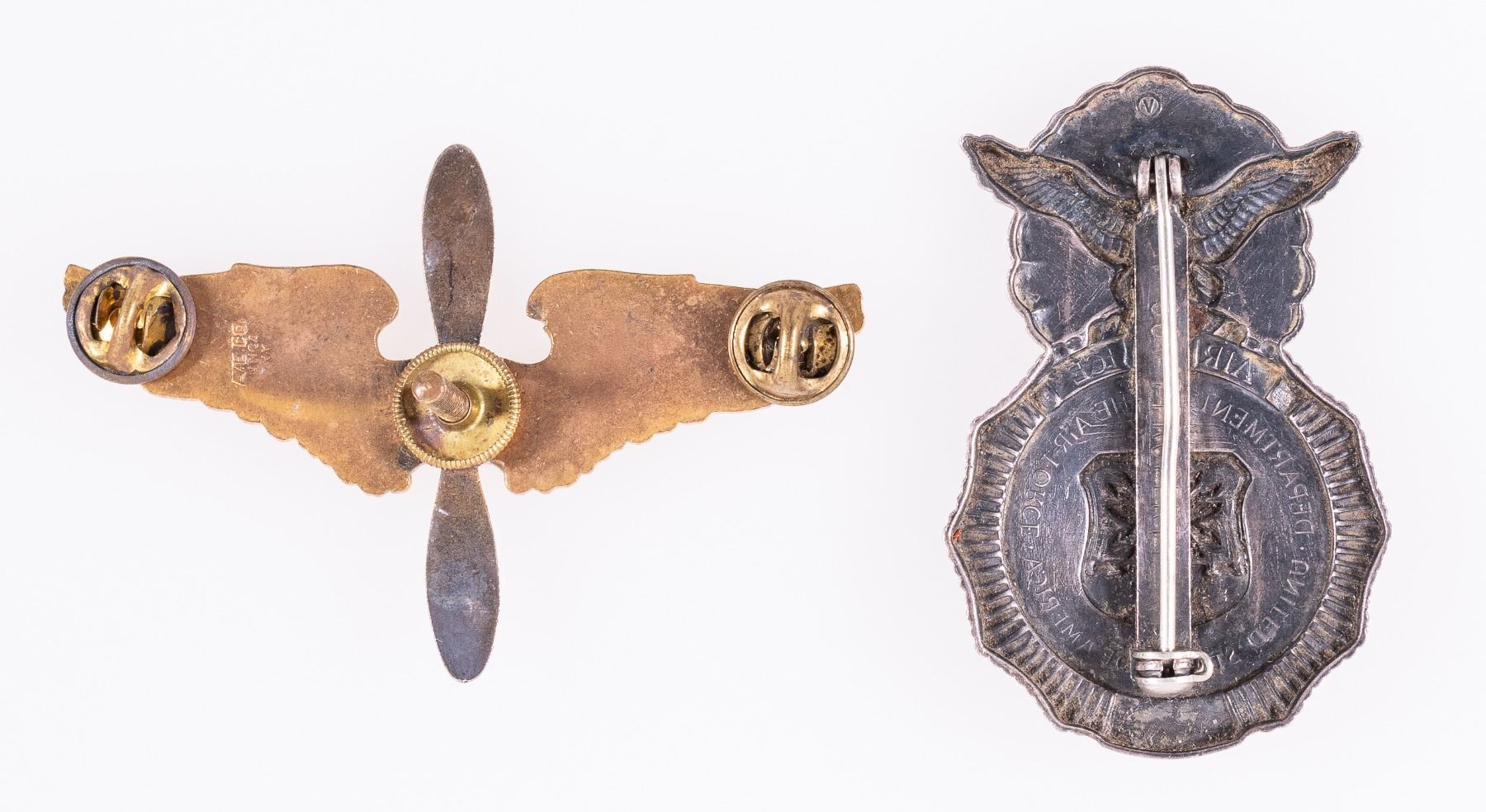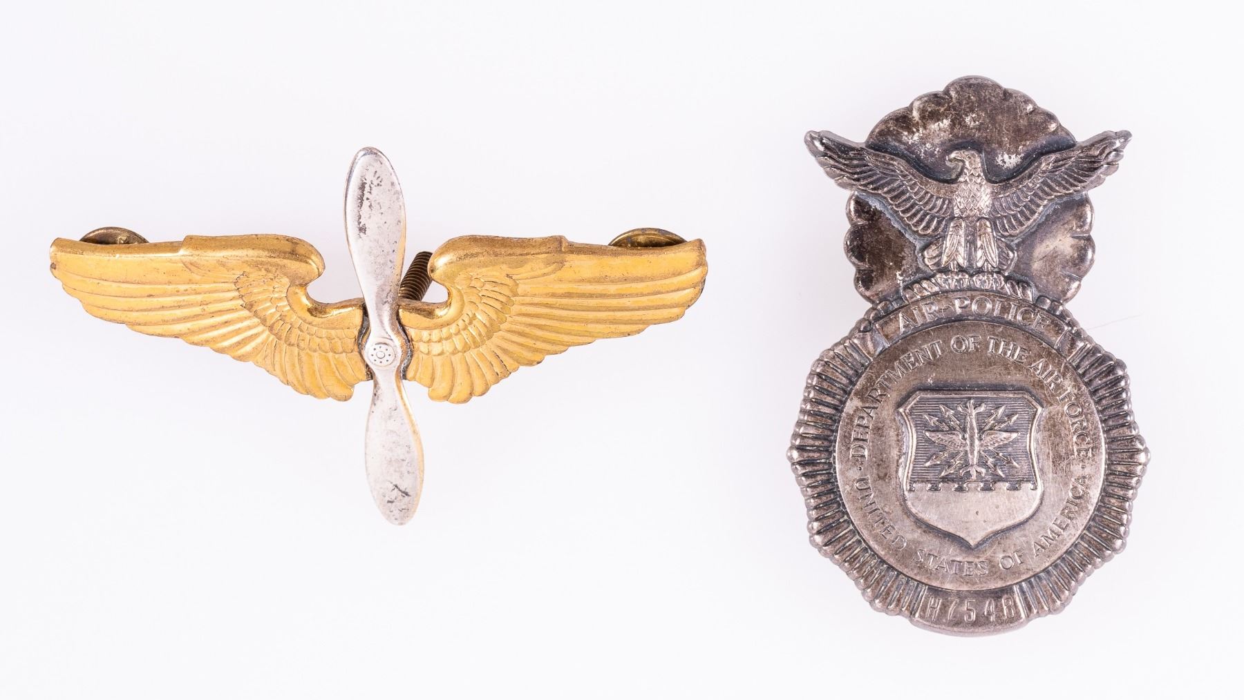 Lot of two US Air Force badges. First, US Air Force Police badge, numbered 'H7548', marked on verso, 'Gov't Property', c-clasp pin-back, 2.5 inches. Second, US Air Cadet Cap badge, marked on verso 'AE Co. Utica, N.Y.', screw-back and pin-back, 3 inches.