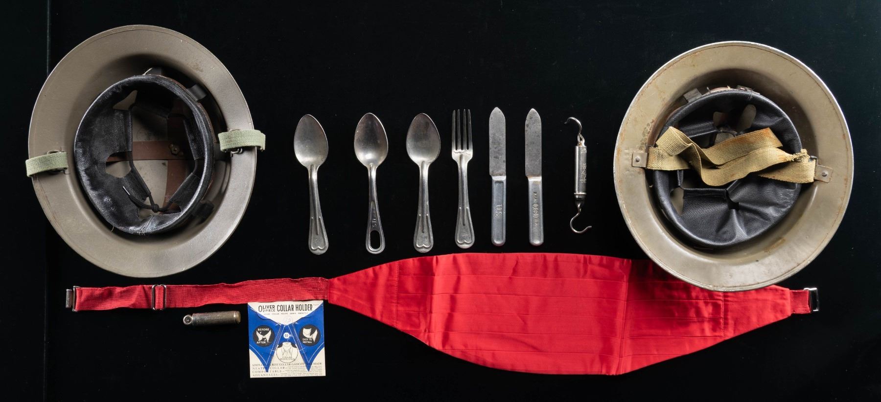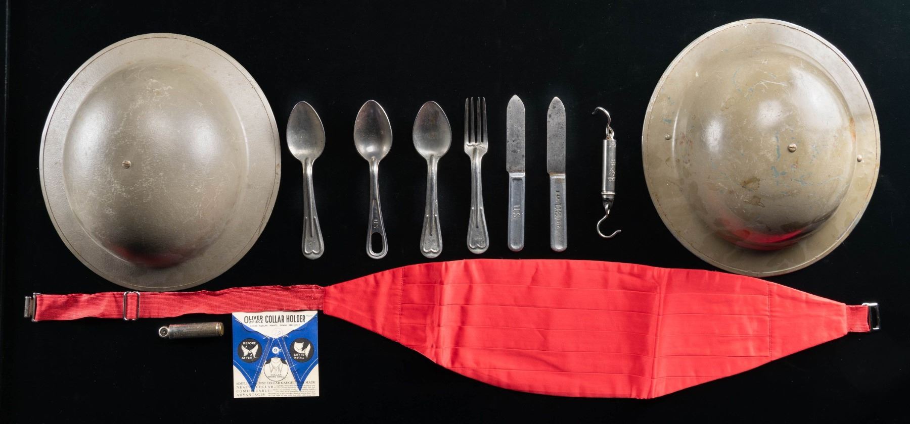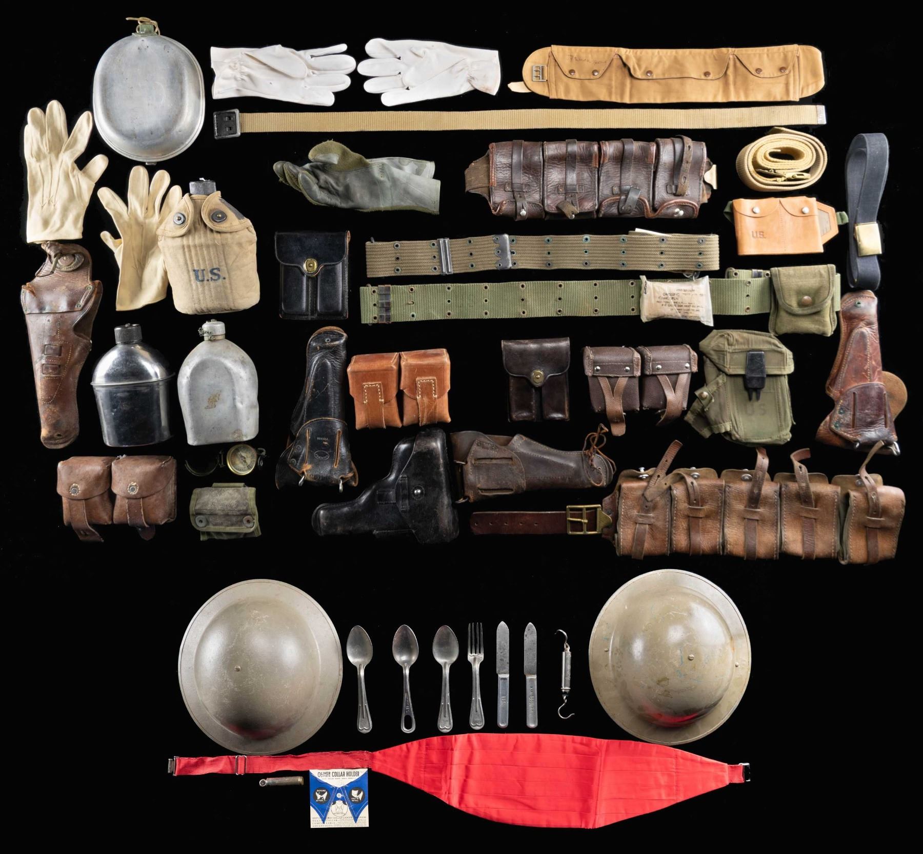 This large and varies lot includes 2 Post WWI US M1917 helmets with liners and chinstraps. / 1 Foreign 5 pocket cartridge belt. / 1 Foreign 4 pocket cartridge belt. / 1 Red cummerbund. / 1 Post WWII Luger holster. / 4 US M1911 .45 cal. pistol holsters. / 2 Aluminum canteens (one with cover). / 1 Stainless steel canteen. 2 OD cotton web pistol belts. / 1 OD nylon web pistol belt. / 1 US compass in pouch. / 3 Foreign two pocket leather cartridge boxes. 2 Clip pouches in leather for M1911. 1 US OD utility pouch. / 1 US WWI mess kit. / 1 Schrader balloon tire gauge. / 1 WWI era scale. 6 Mess kit utensils. / 1 Canvas and leather sling. / 4 Web uniform belts. / 1 US issue leather money belt. / 1 US issue cotton money belt. 2 Pair of white gloves. / 1 OD glove. CONDITION: most all of the items in this lot show light wear with no notable damage. (02-24055/BF). NON-GUN. $300-500.