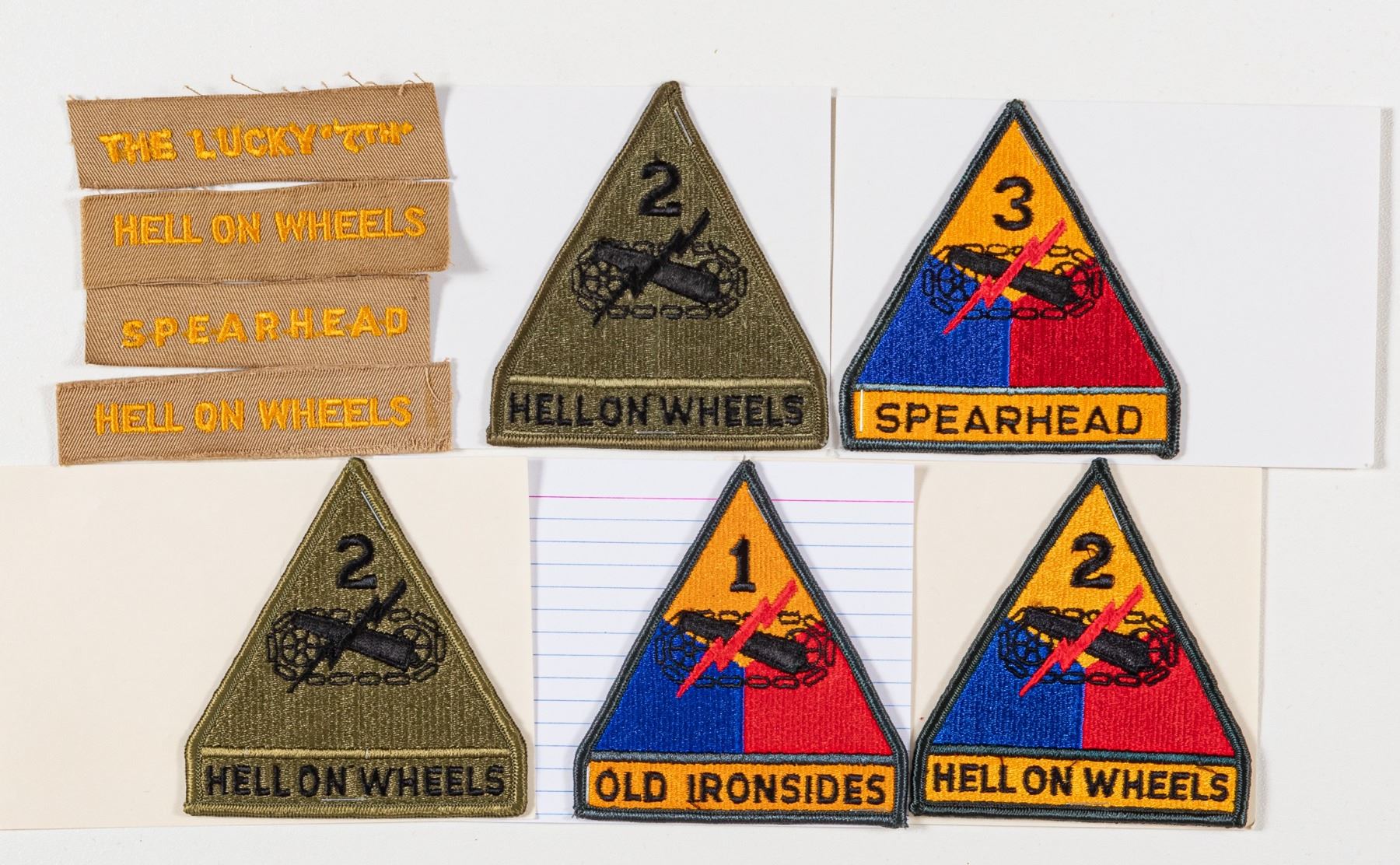 Lot of nine armored division patches for 1st, 2nd, and 3rd. Approx. 4 x 3.5 inches. Stapled to index cards.
