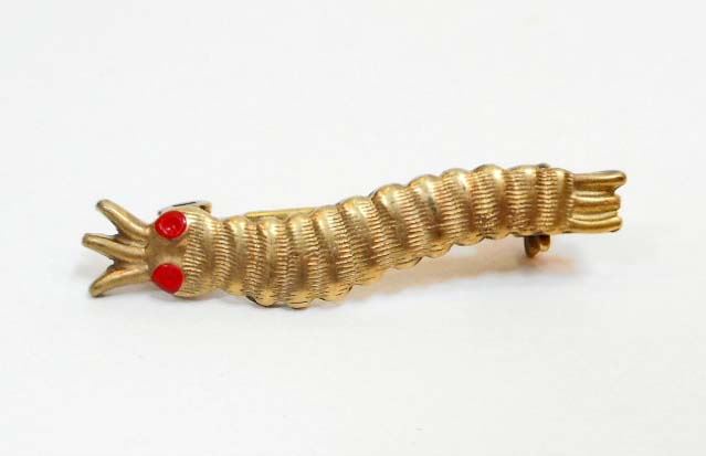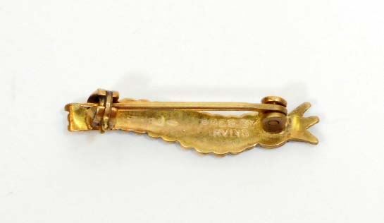 Measures 3/16" wide by 1 3/16" tall. The reverse side is maker marked 'Pres By Irving Sterling'. Has a thin horizontal pin back with a locking 'c' catch. The eyes are painted red.