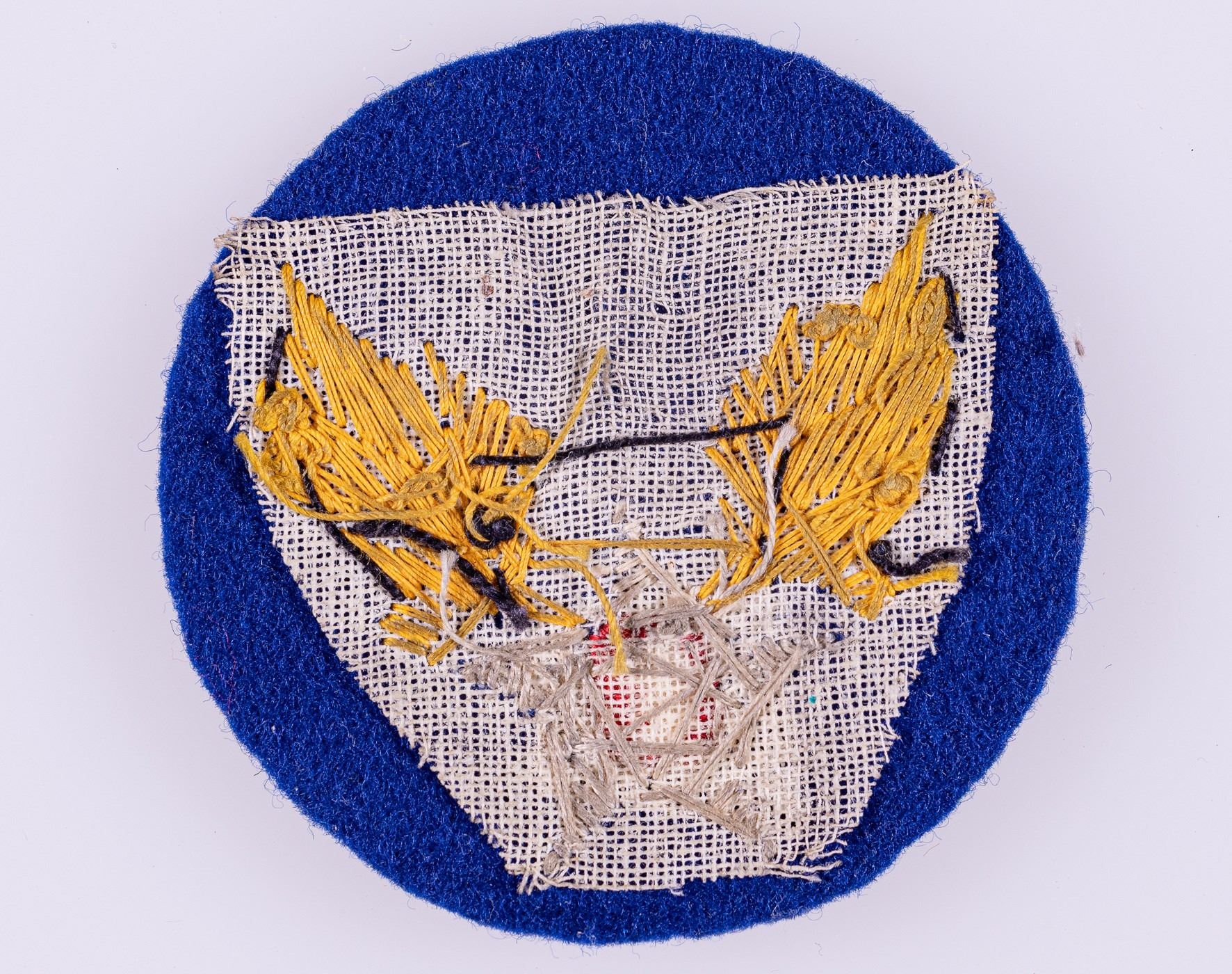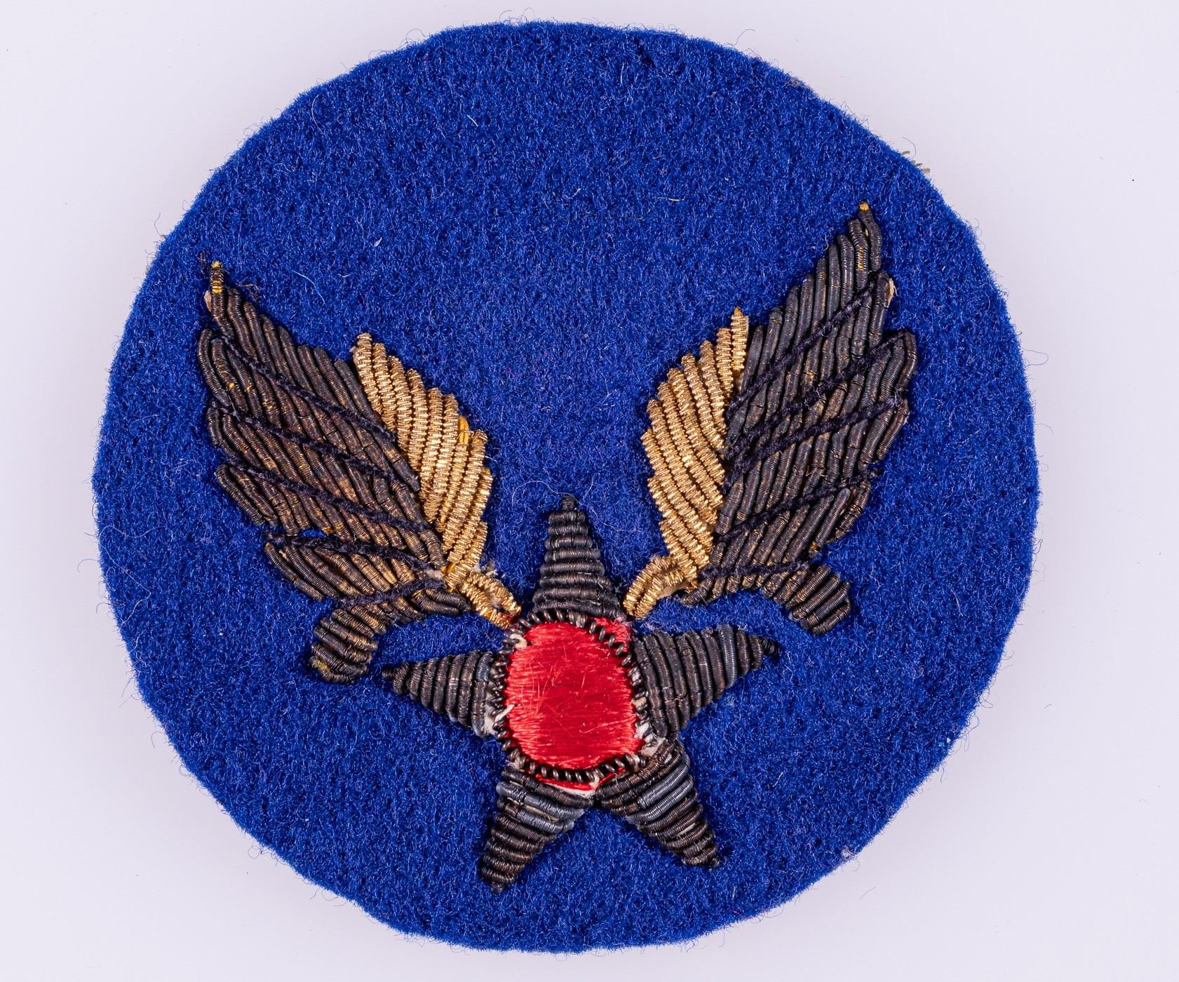 USAAF buillon patch showing a red-centered star with wings. 2.5 inches in diameter. Stapled to index card.