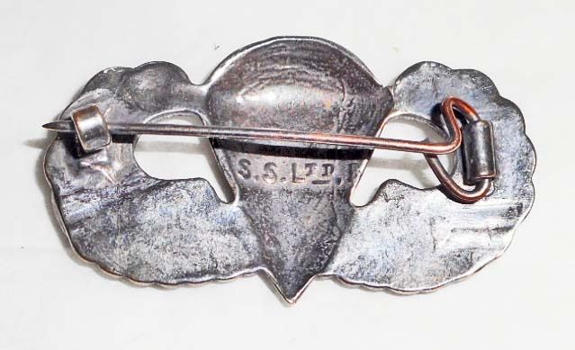 Measures 1 9/16" wide by 7/8" tall. The reverse side is maker marked 'SS Ltd'. Has a thin horizontal English style pin back. Nickel construction.