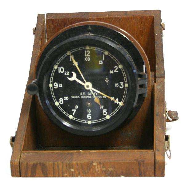 A Chelsea M2 U.S. Army clock in its original box. Movement is strong, not over wound, but needs service, in its original box.