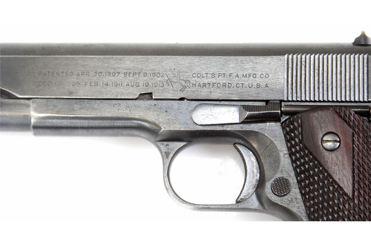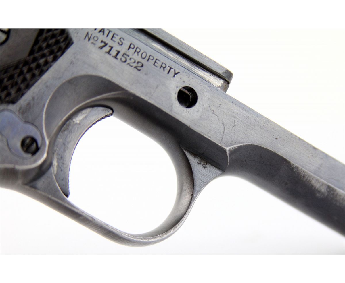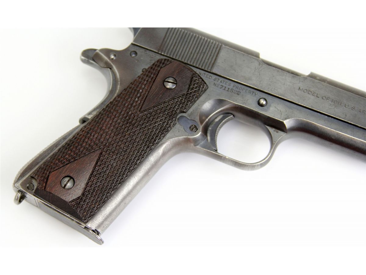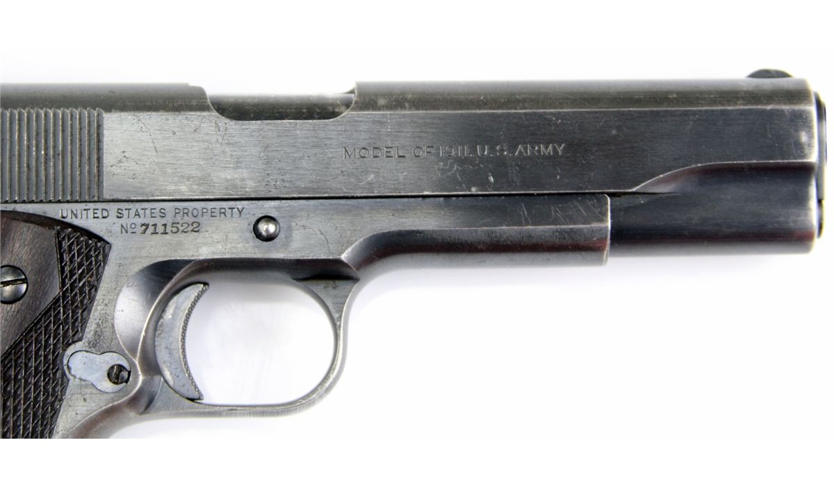 US ARMY COLT 1911 PISTOL US PROPERTY 1937 US Army Colt 1911A1 pistol, with US Property Mark, manufactured in 1937. Extra magazine included. Type: Pistol Manufacturer: Colt Model: 1911 Caliber / Gauge: .45 Barrel Length: 3.5" Serial Number: 711522 Condition: Bore is very good. Some slight wear and oxidation. Overall 80%.