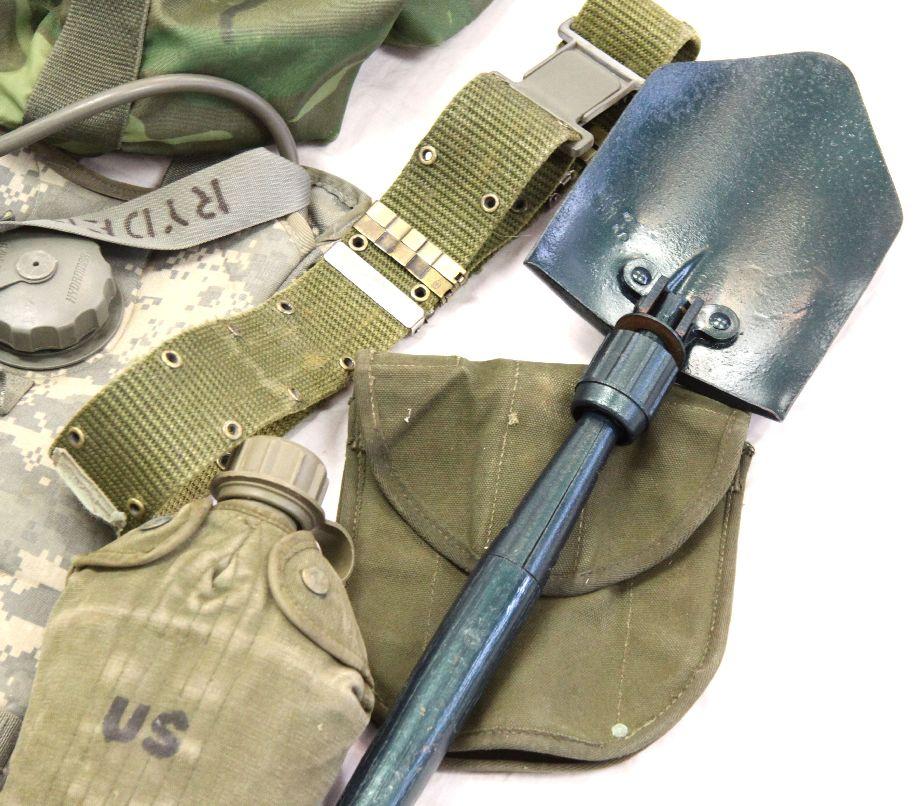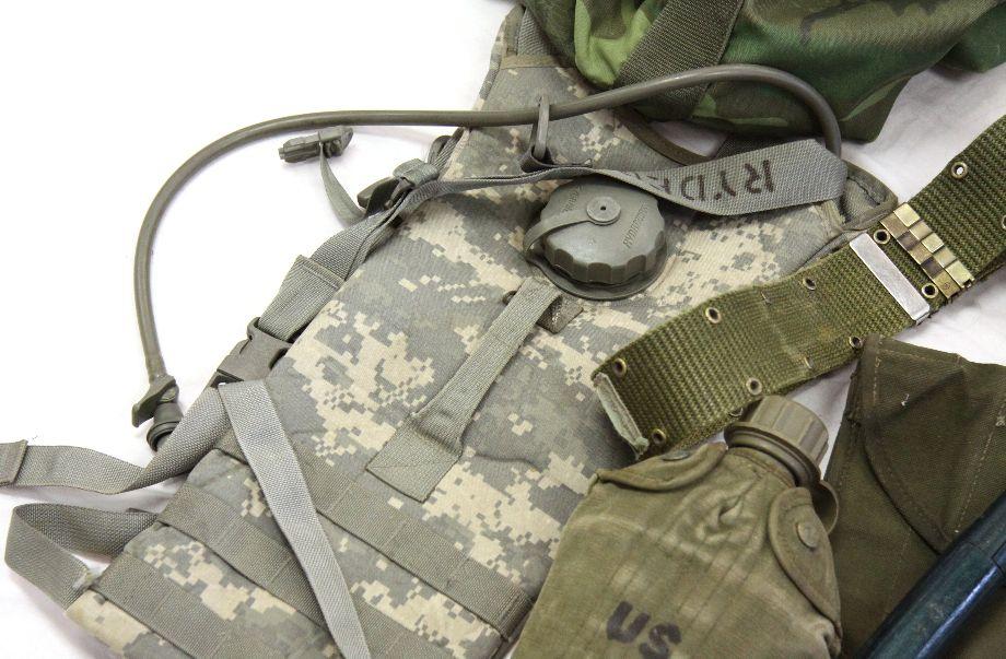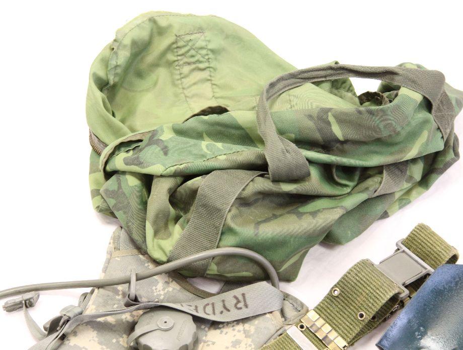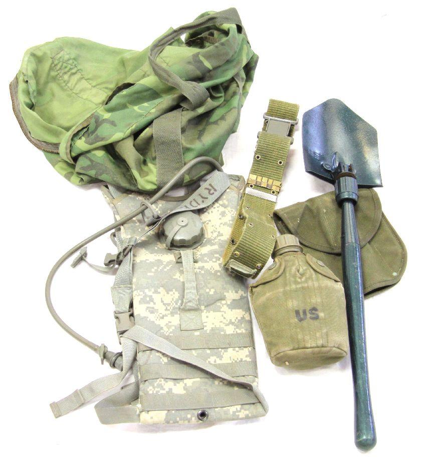 A lot of modern gear to include canteen, a gulf war hydration system, shovel, helmet webbing and a flight bag, all very good.