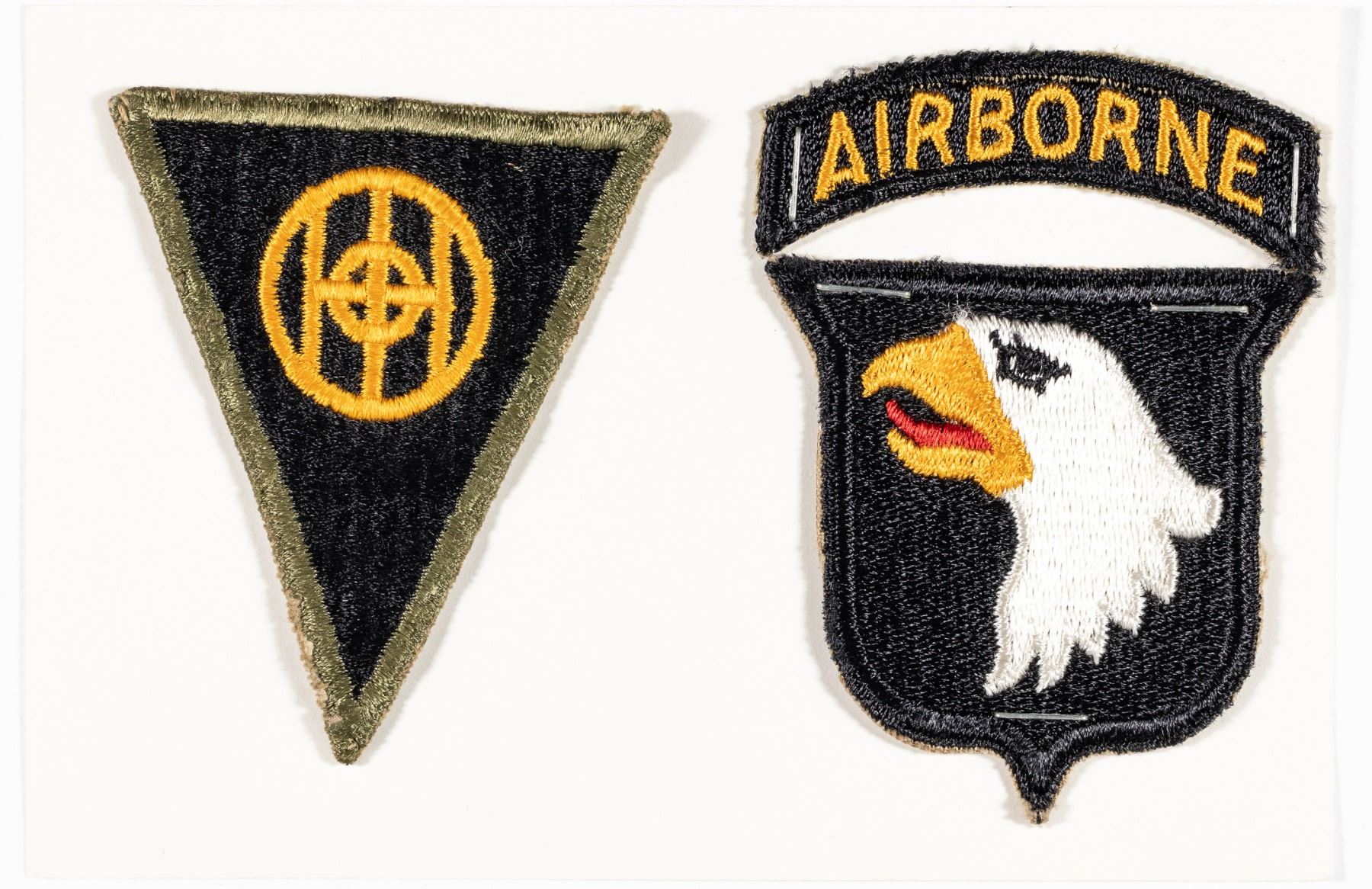 Lot of two US Army patches for the 83rd Division and the 101st Airborne Division. Stapled to index cards.