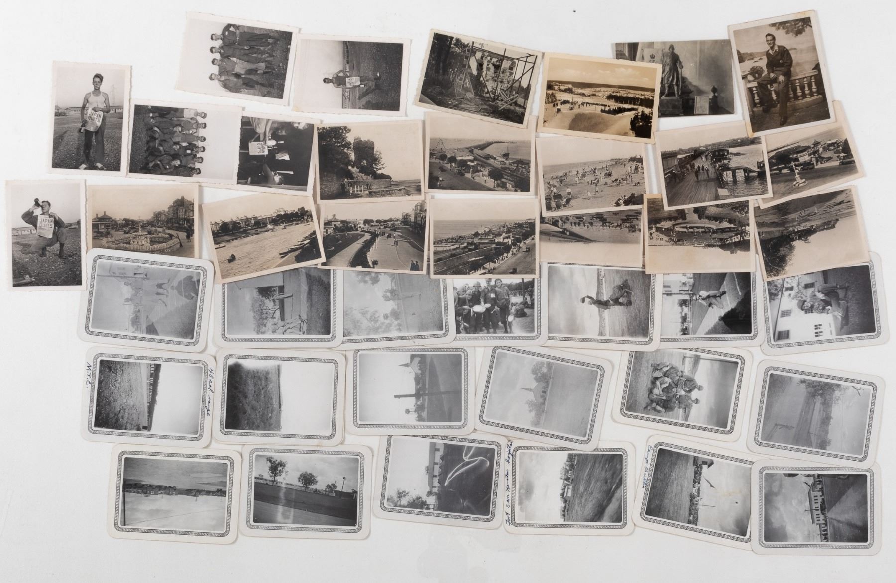Group of candid and personal post-WWII photographs. Photos show soldiers at a firing range, Fort Sam Houston Hospital, soldiers socializing, soldiers holding newspapers with 'Japan Quits!', and scenic photographs of Texas. Some photos are taken at Camp Bullis in San Antonio, Texas and dated 1946. Included is a group of photographs of the Isle of Wight, probably taken in the early 1930s. Approx. 2.75 x 4 inches. Some photos have stamps or inscriptions on verso.