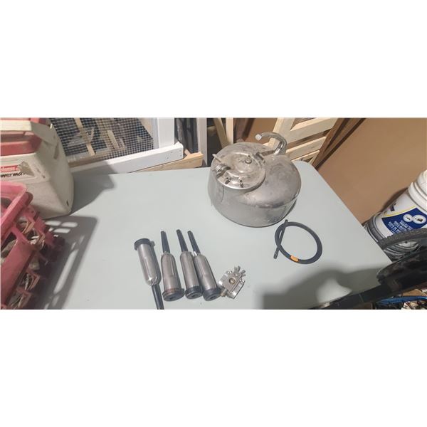639 - WATERING CAN, RAKE HEADS, PLANT POTS, SPRAYER, OLD GERRY CAN COMES WITH CONTENT, FEED BINAR25 Auctions