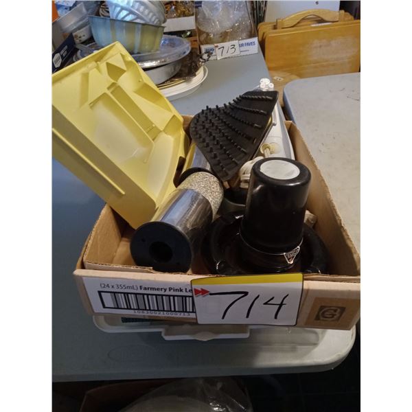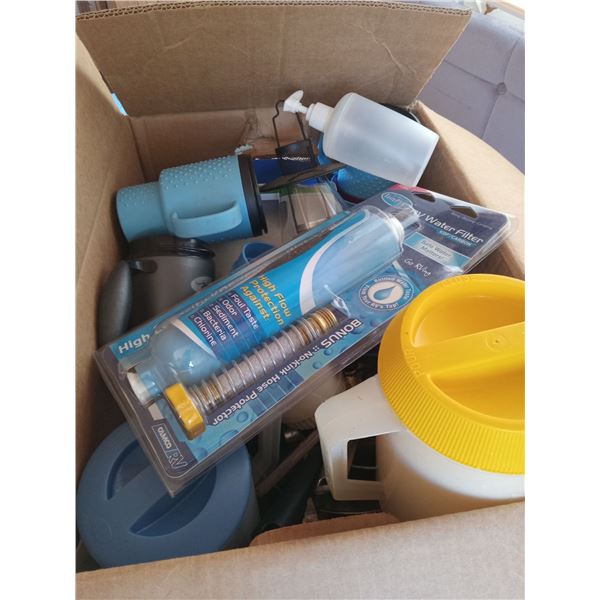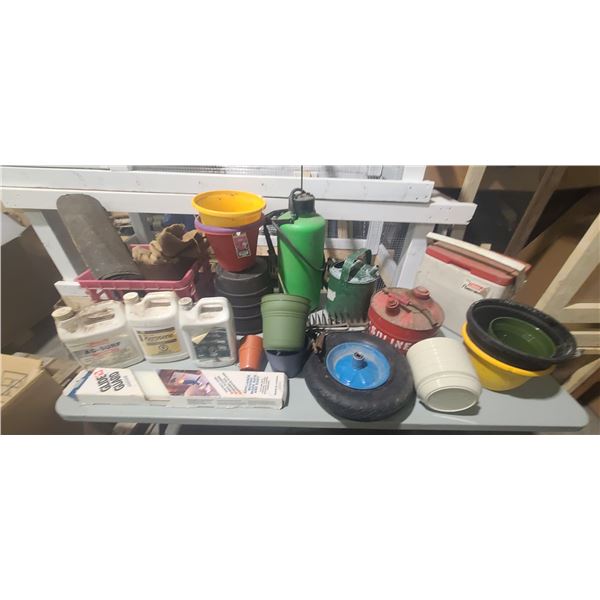 WATERING CAN, RAKE HEADS, PLANT POTS, SPRAYER, OLD GERRY CAN COMES WITH CONTENT, FEED BIN