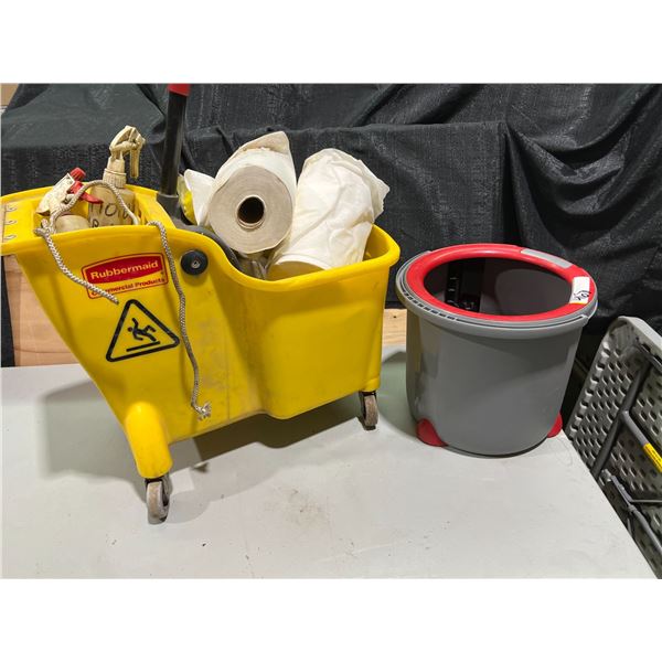 TWO MOP BUCKETS, ASSORTED CLEANING SUPPLIES, MOPS