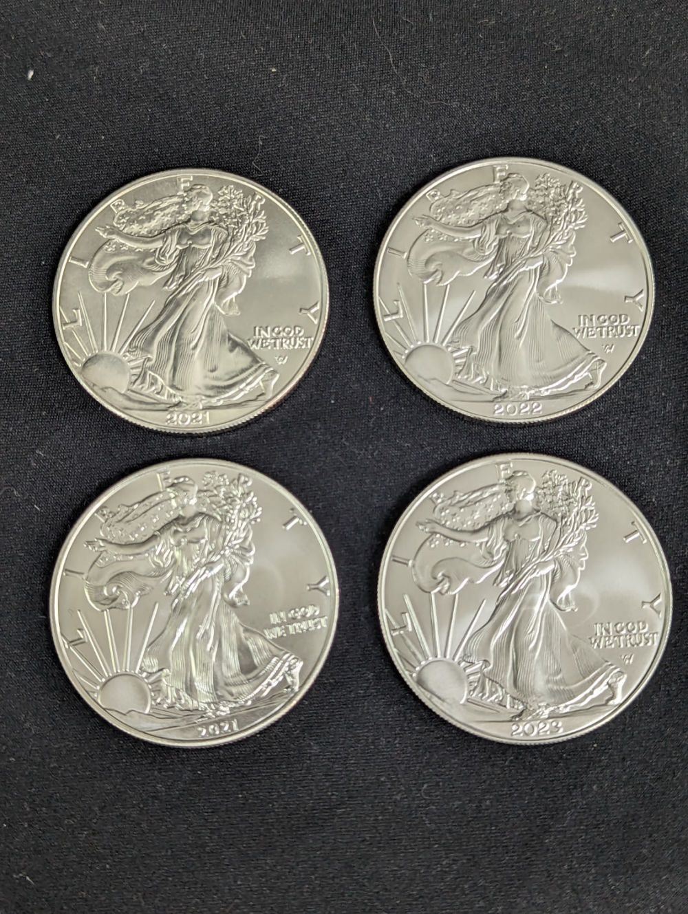 A US American Silver Eagle Update set, Four (4CT) coins which Include the 2021 Type 1 & amp; 2 2022 and 2023 all Choice BU selected from original rolls. Great way to to update your set with the New Reverse American Silver Eagle.