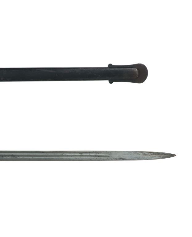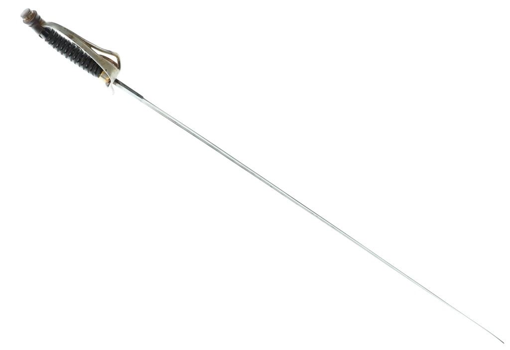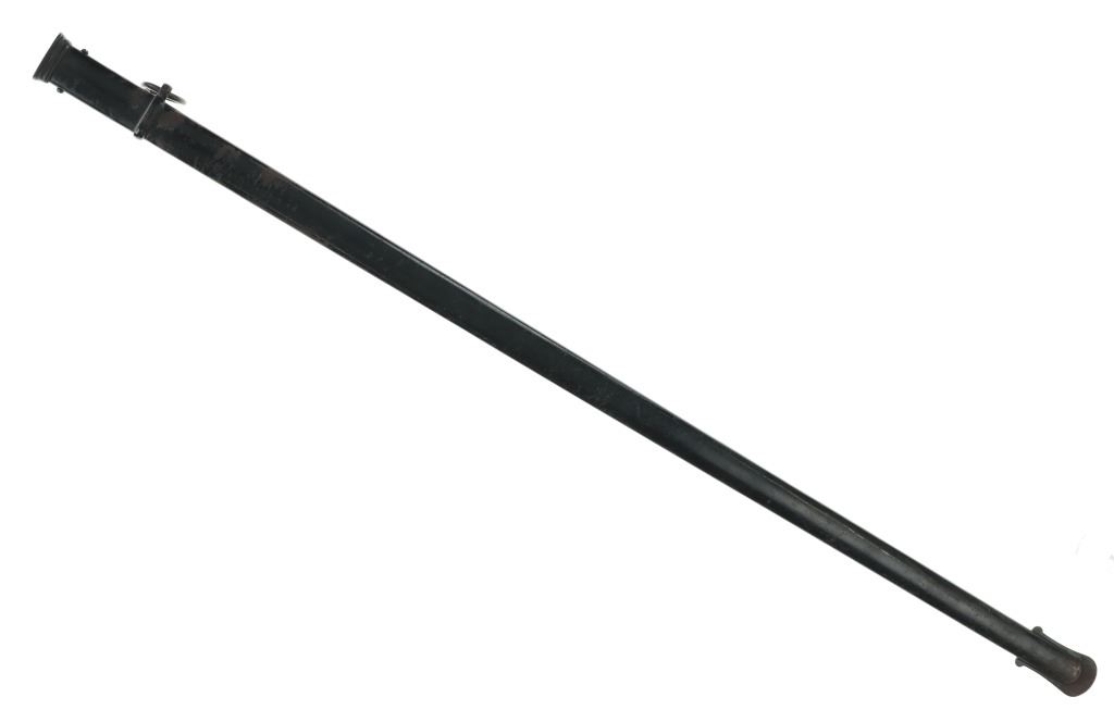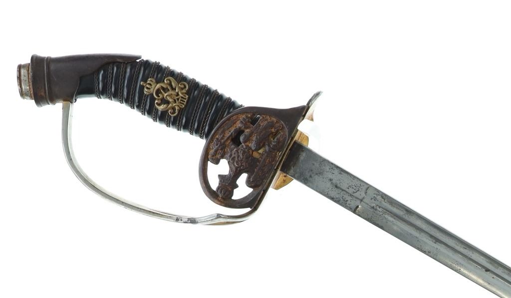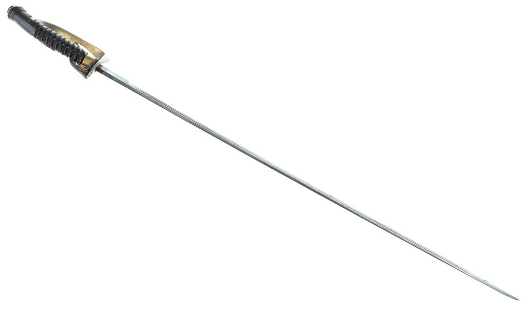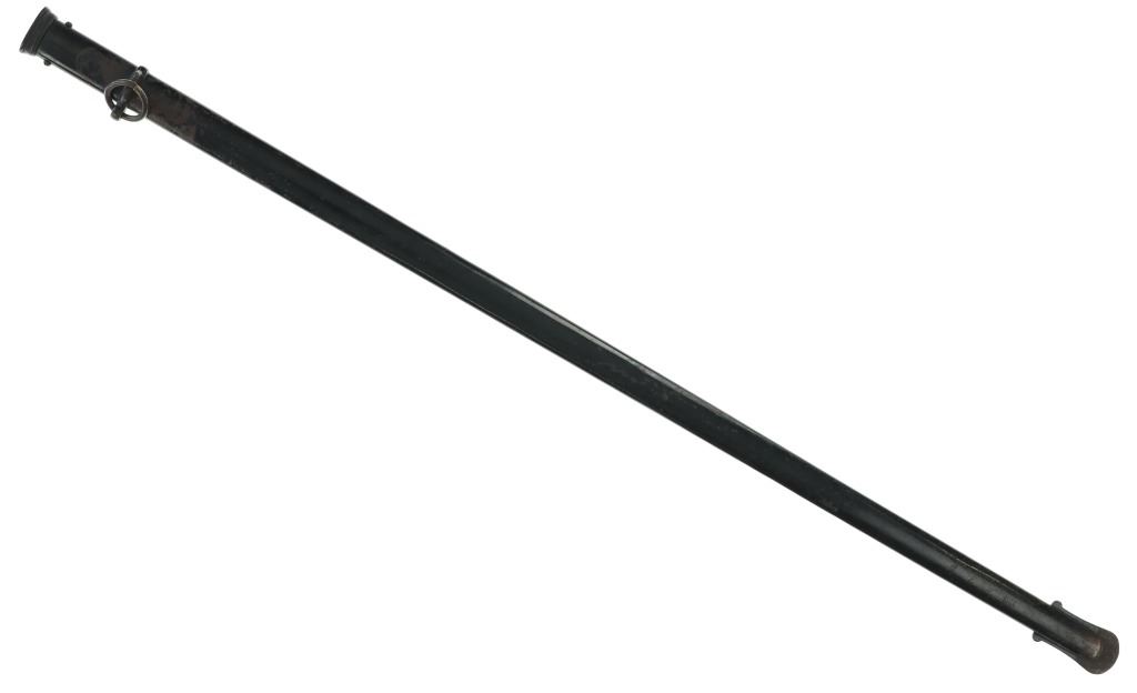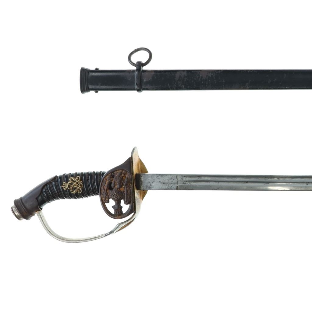 Featured in this lot is this US Army M1902 officers cavalry sword & sheath. The sword features a straight single edged blade with a brass guard that features an ornate depiction of a eagle with two swords in its claws; and shows a composite curved handle that brass decoration attached to the handle. The piece comes with a metal sheath with attachment loops. The condition of this sword is good with no obvious signs of damage and shows good overall condition. The measurements of this cavalry sword is 37 1/4 x 4 1/2" x 2 1/4".