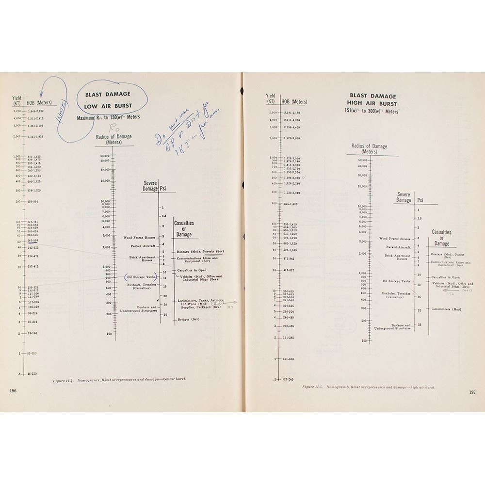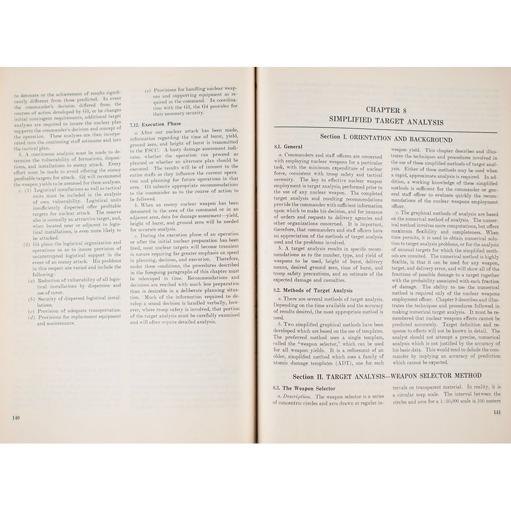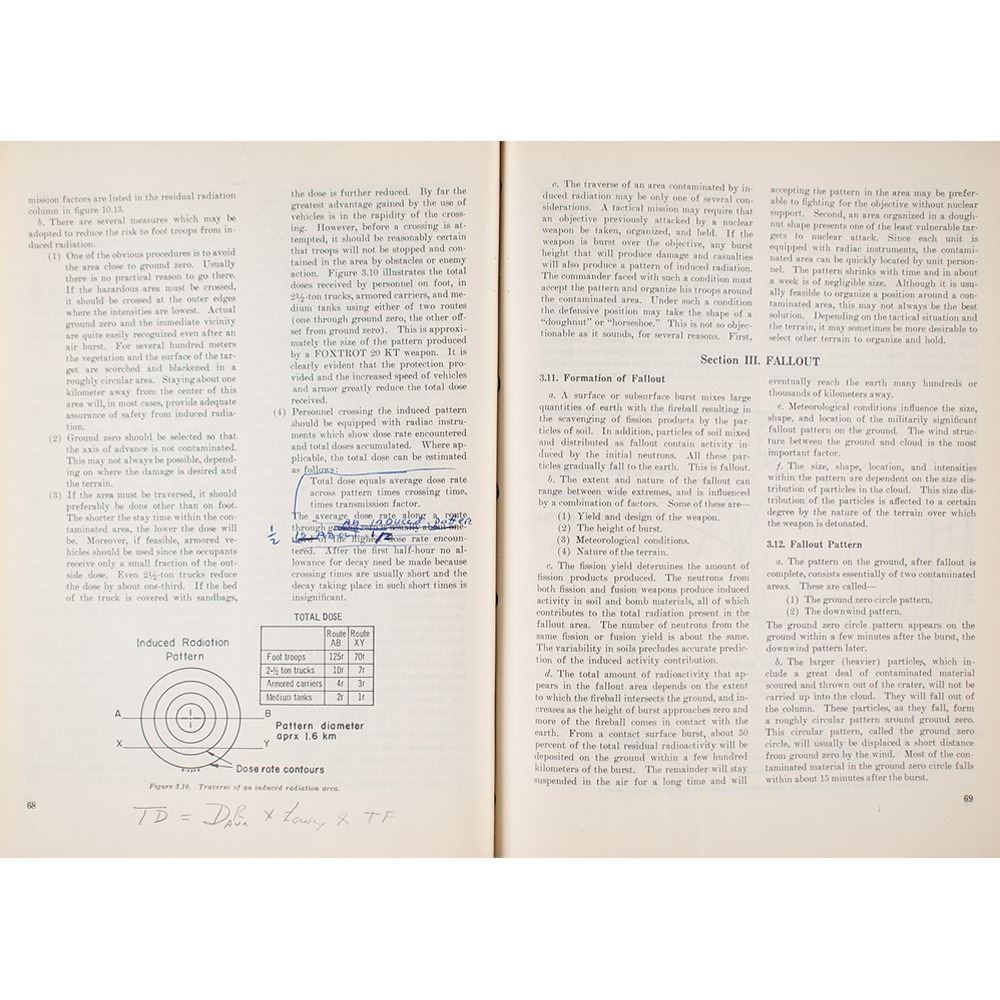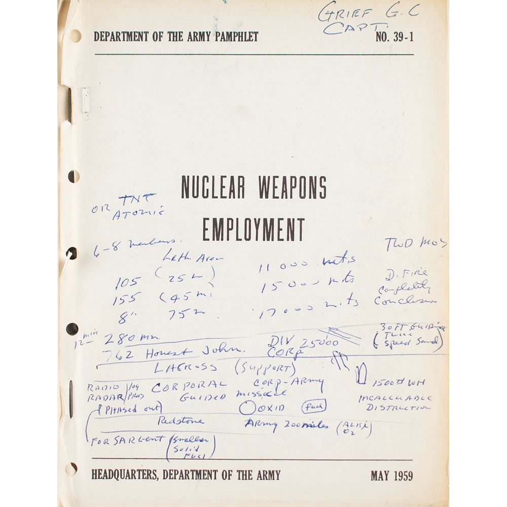 Staple-bound "Department of the Army Pamphlet, No. 39-1, Nuclear Weapons Employment," 221 pages, 7.75 x 10, May 1959. The document provides an "unclassified reference for instruction in the employment of nuclear weapons," providing background information of their initial and residual effects, techniques followed in planning for the employment of nuclear weapons, and figures and nomograms used in making a target analysis. Stapled inside is a translucent map overlay used for the prediction of radiological fallout. In very good to fine condition, with many annotations on the covers, and a few to the text inside.