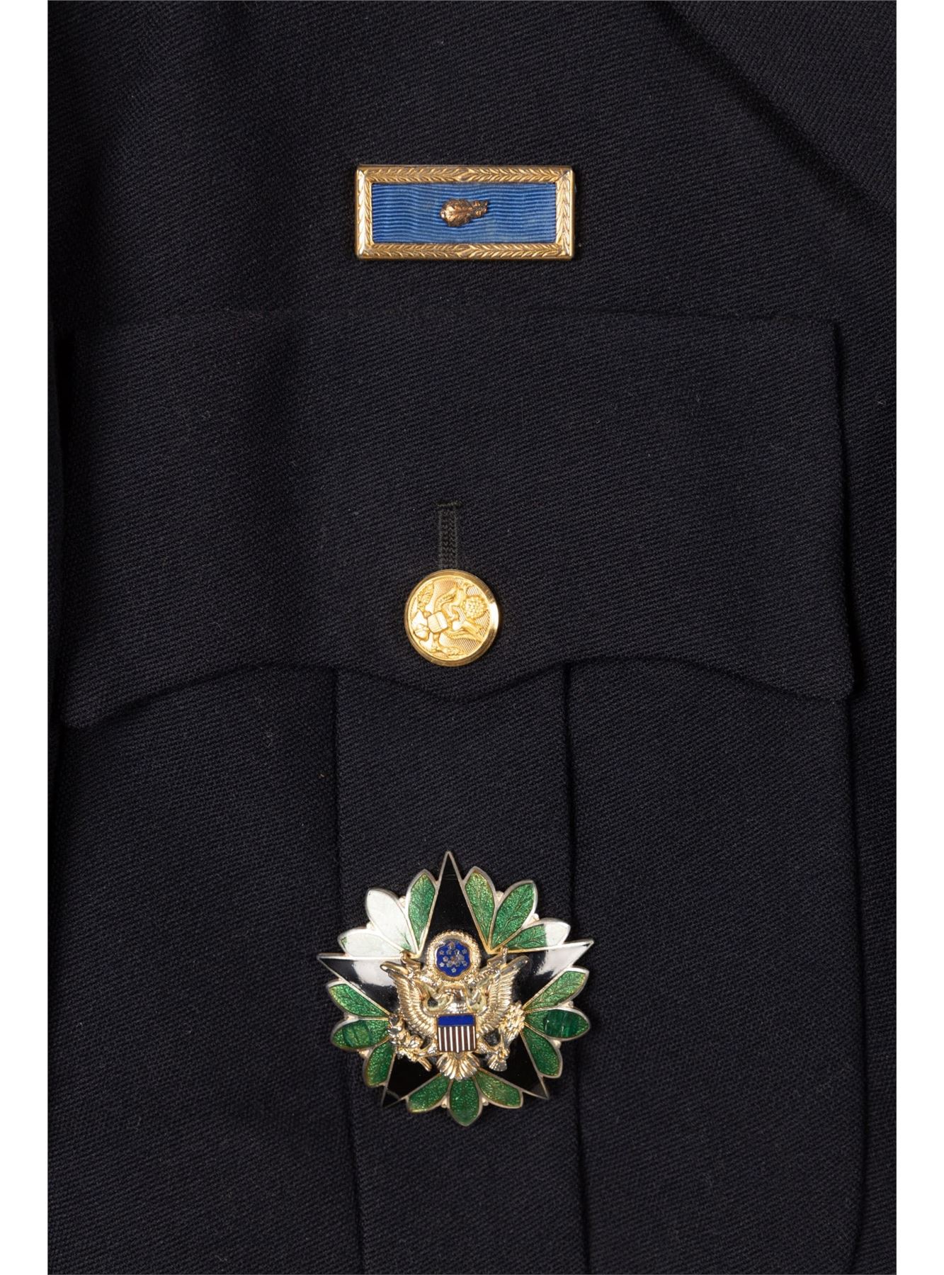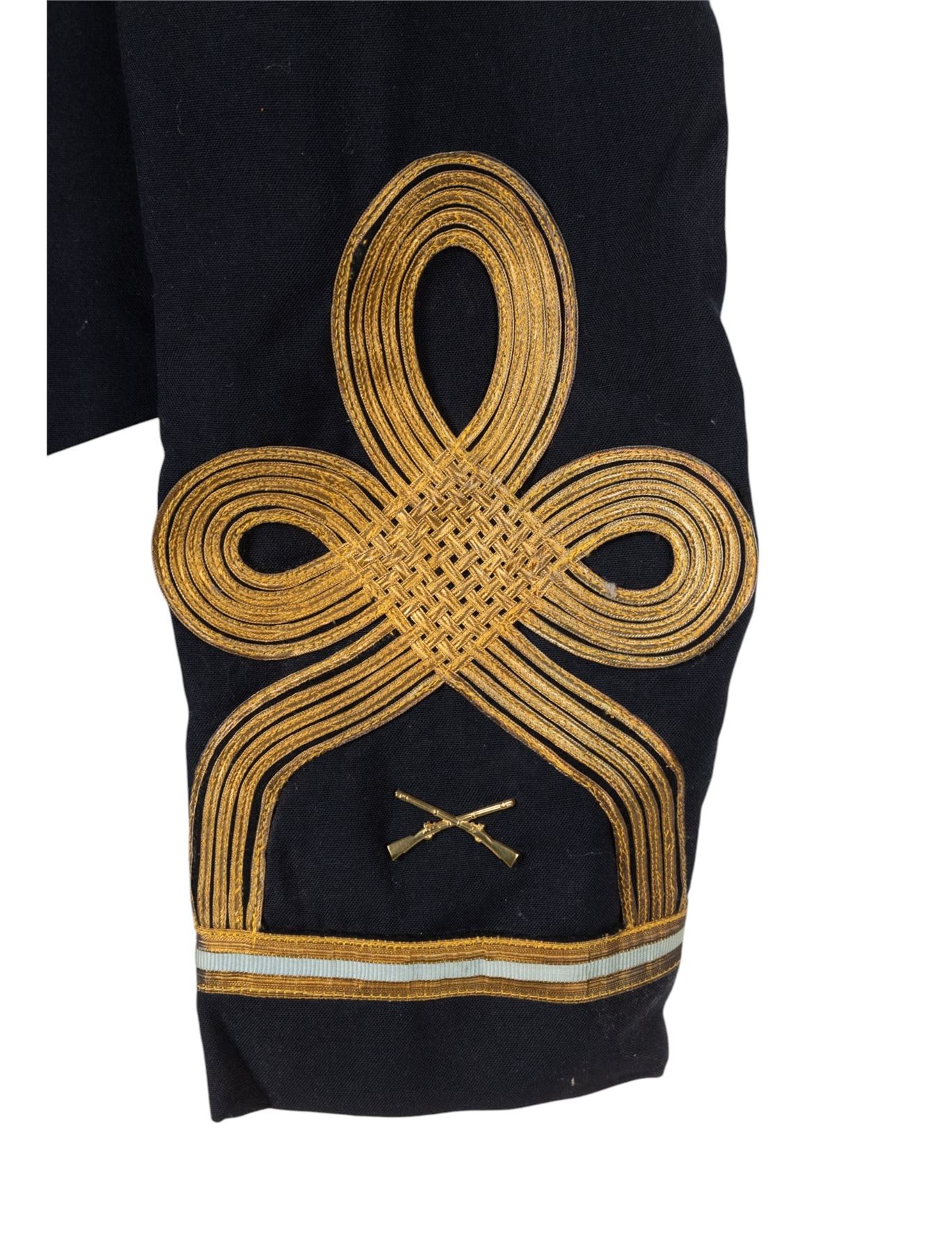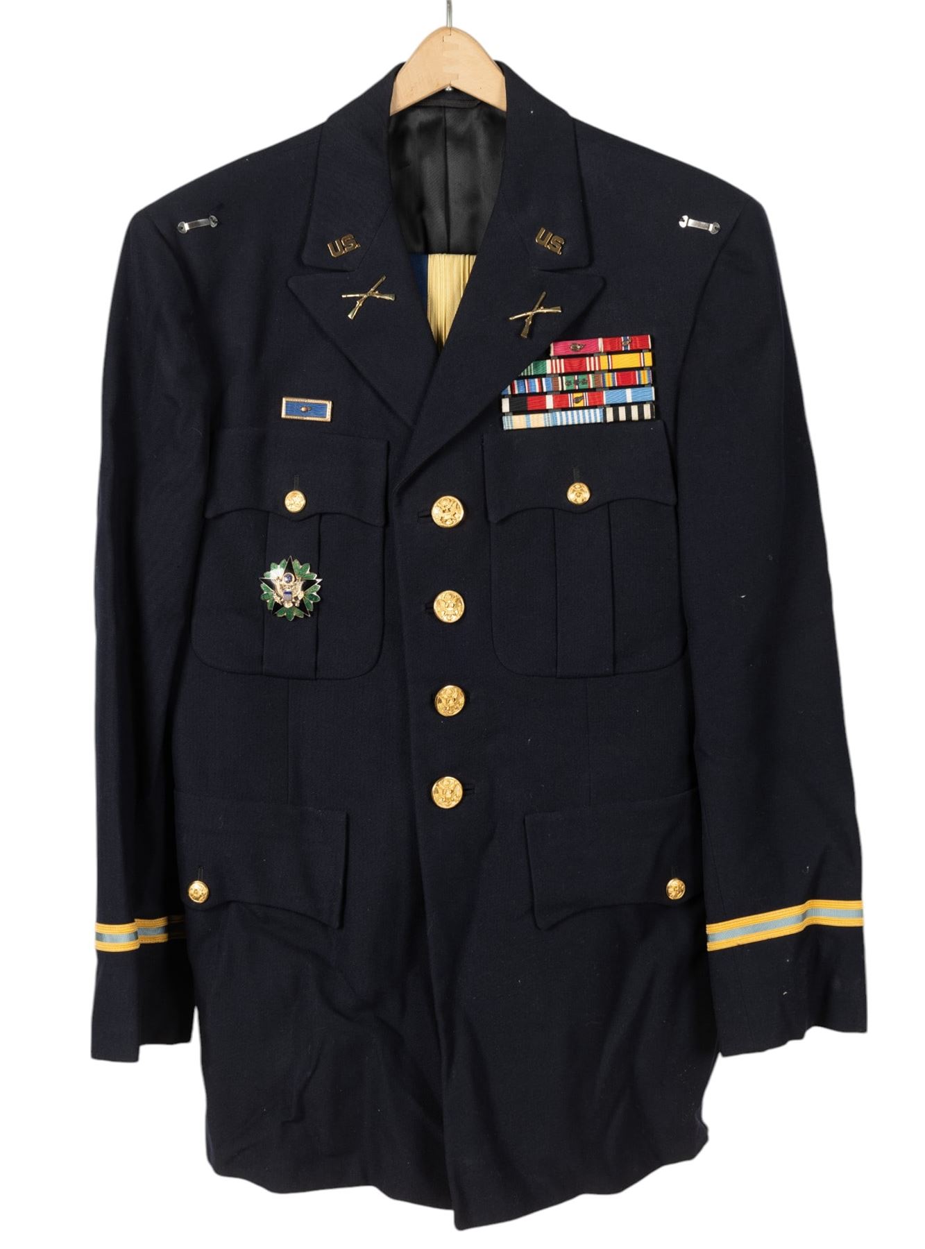 Army Rifleman officers dress uniform made by Lautersteins San Antonio with DOD Staff officer brooch, 17" shoulder and 30" waist for the pants and Riflemans mess dress uniform jacket, 17" shoulder.
